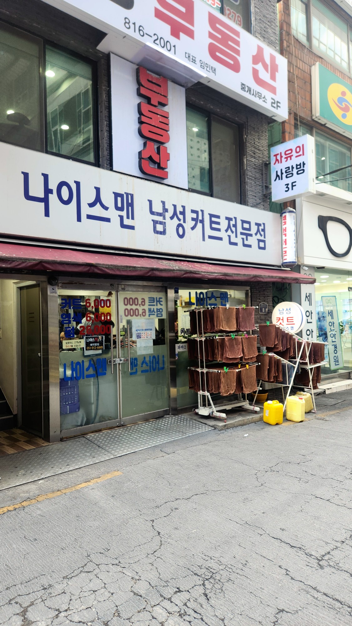 부동산 건물 1층에 위치한 나이스맨은 매장 앞에 걸린 수많은 수건이 그 인기를 증명합니다.