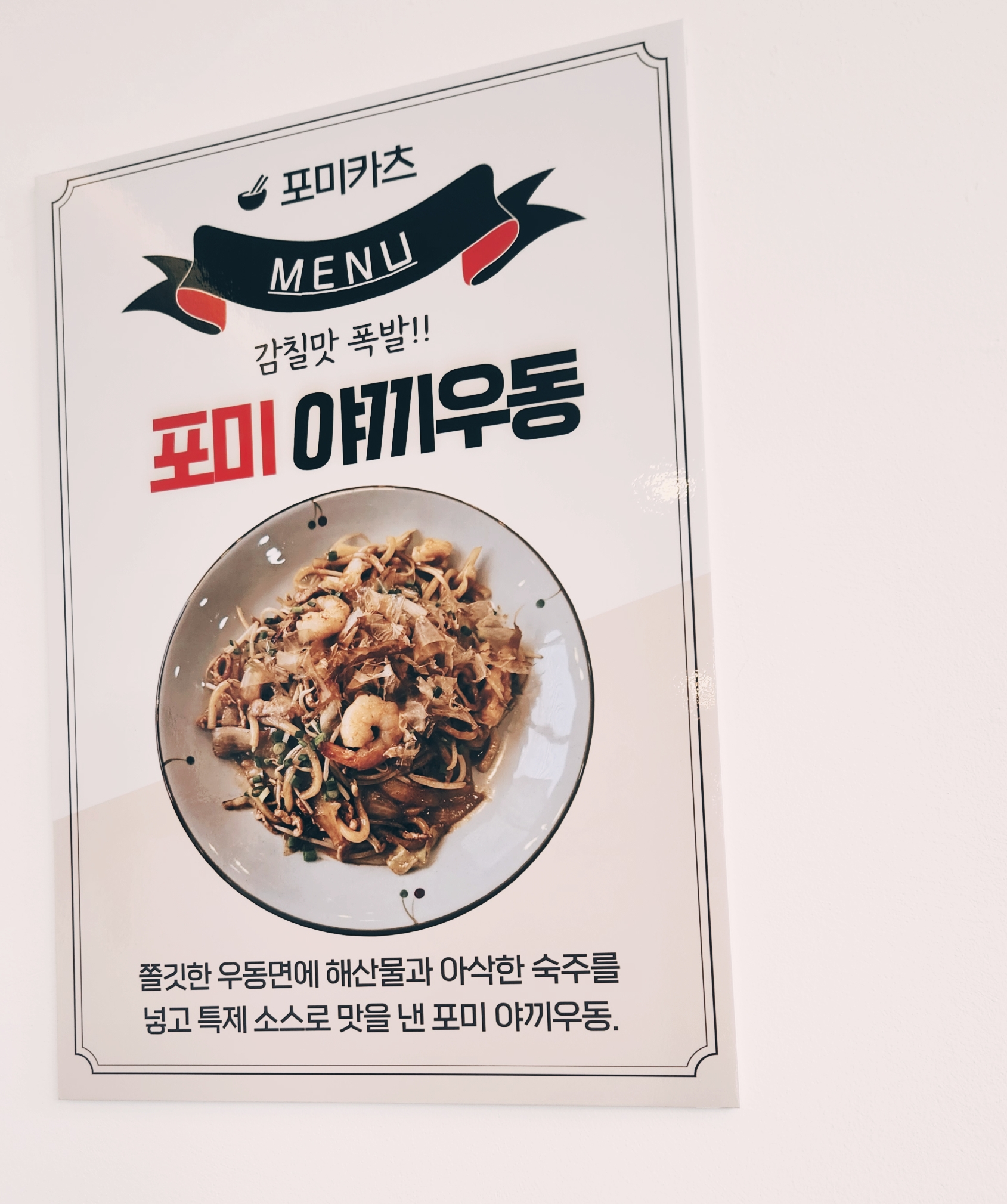 매장 앞에는 대표 메뉴인 히레카츠와 야끼우동 사진이 걸려 있어 들어가기 전부터 식욕을 자극합니다.
