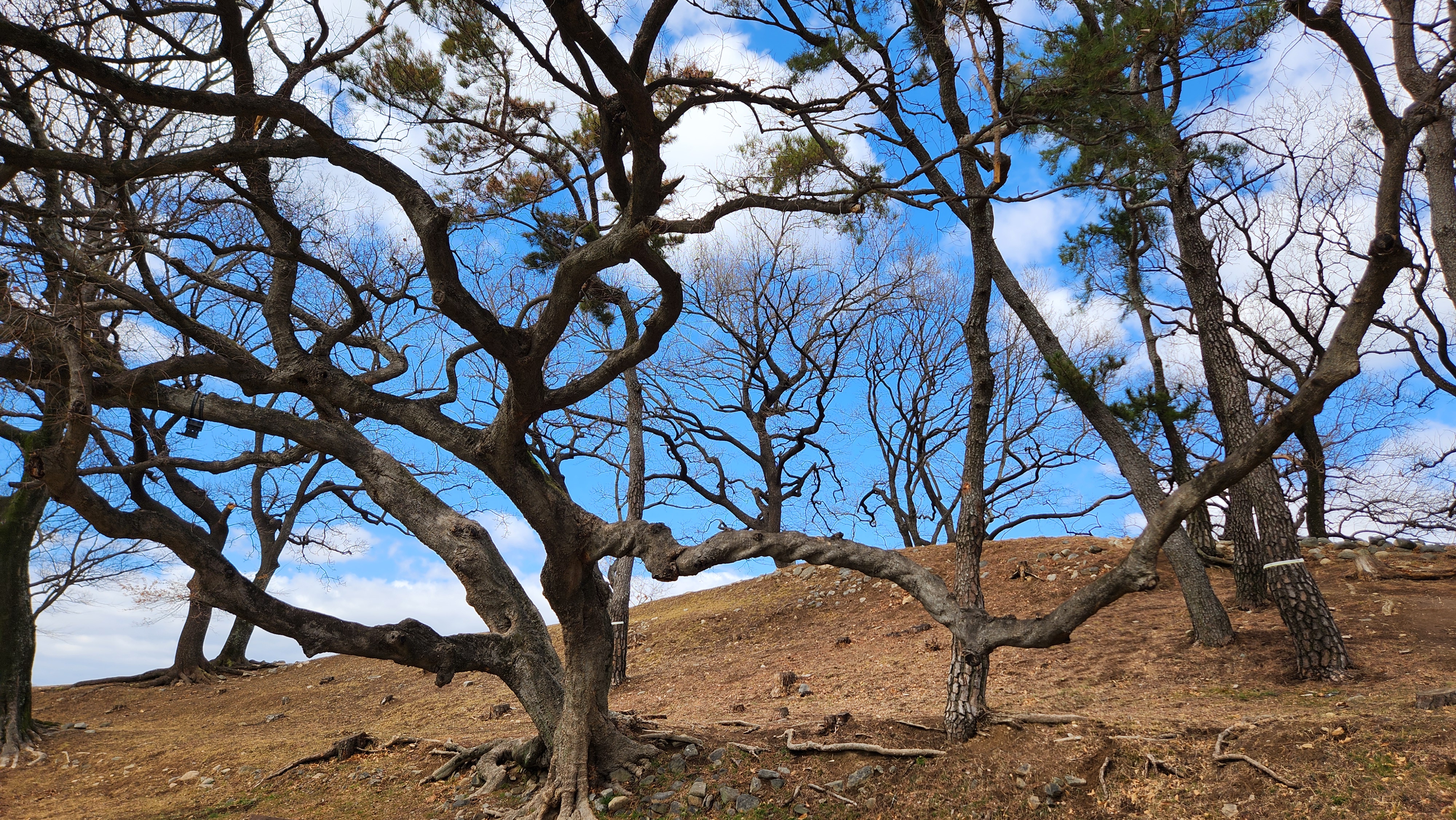 석빙고를 감싸고 있는 소나무들은 굽이굽이 멋진 곡선을 그리며 푸른 하늘과 대비를 이룹니다.