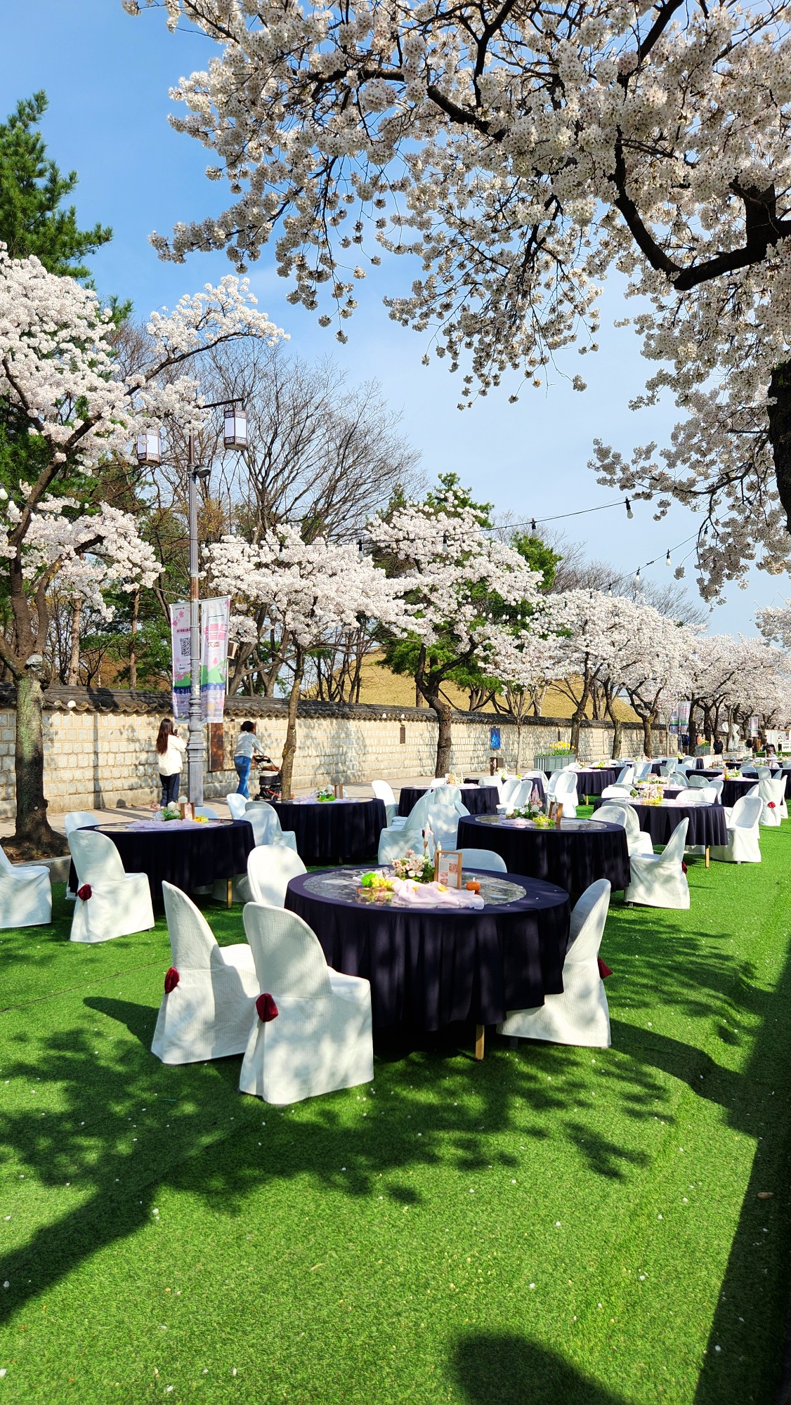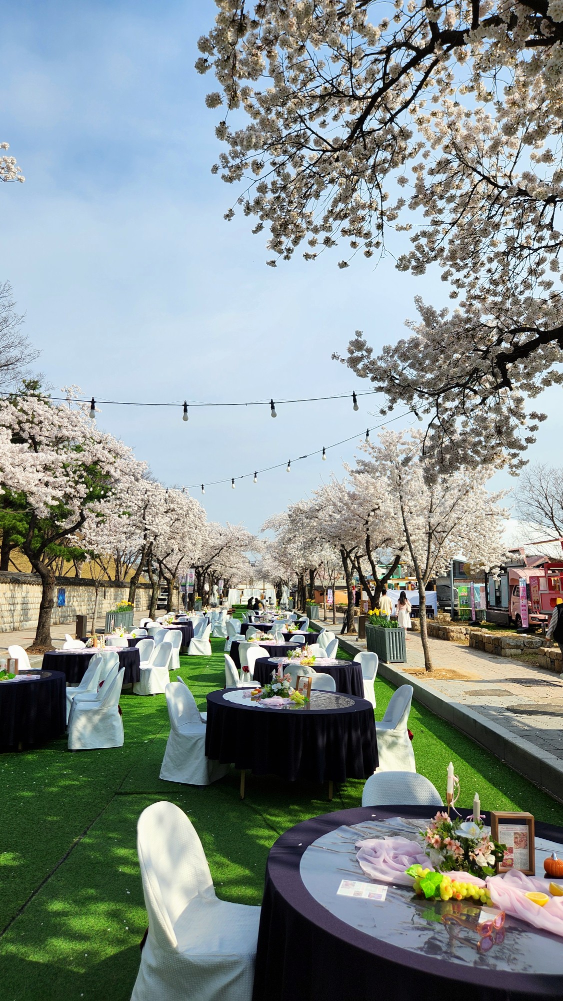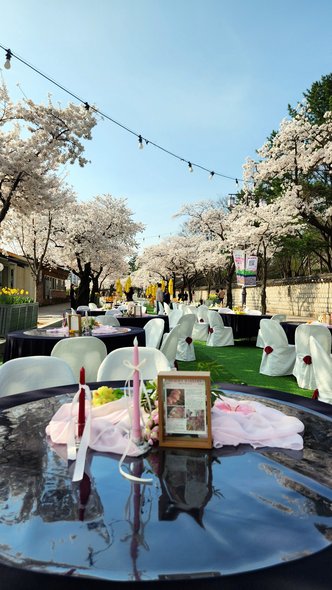 사진을 보시면 길 한가운데 인조 잔디가 깔리고 고급스러운 연회 테이블이 세팅된 것을 볼 수 있습니다.