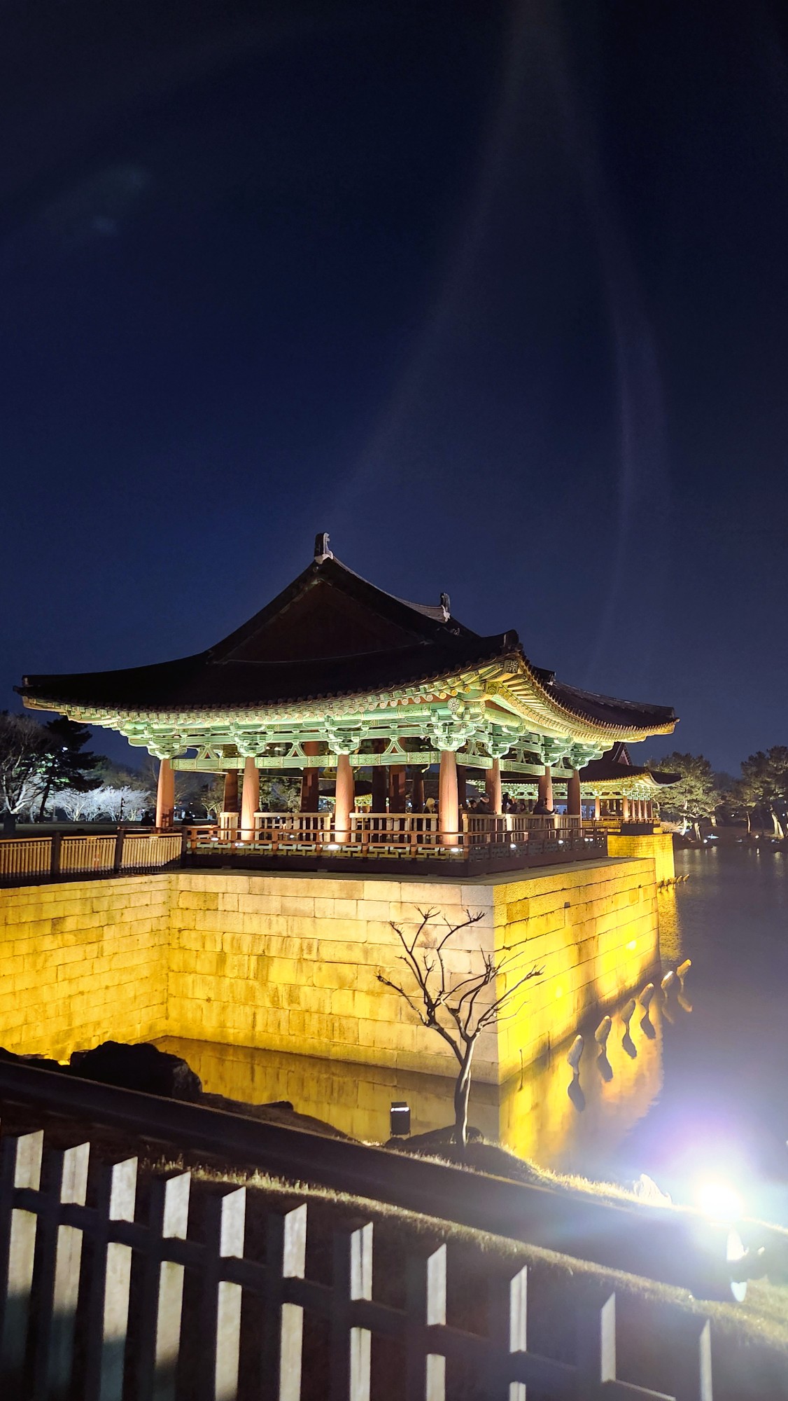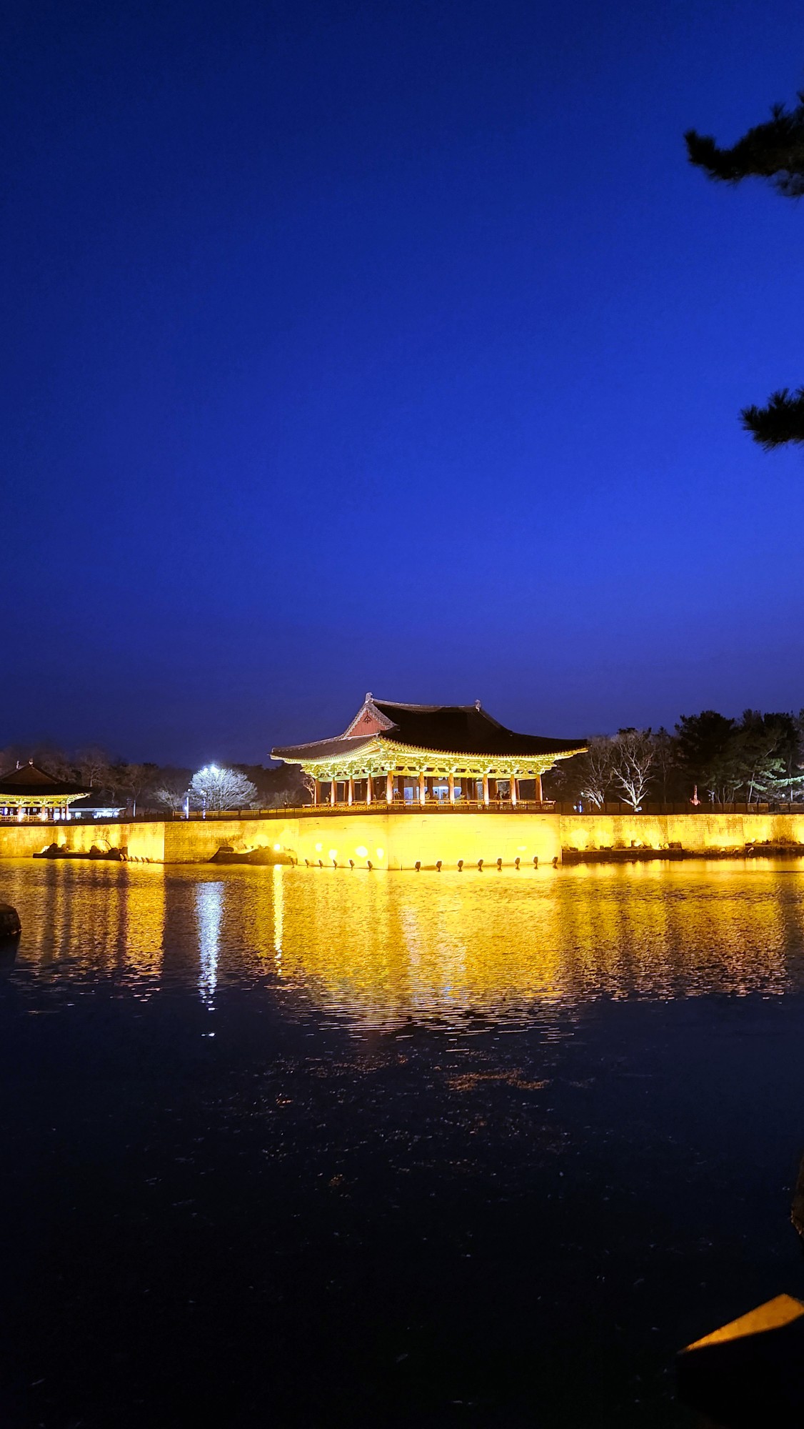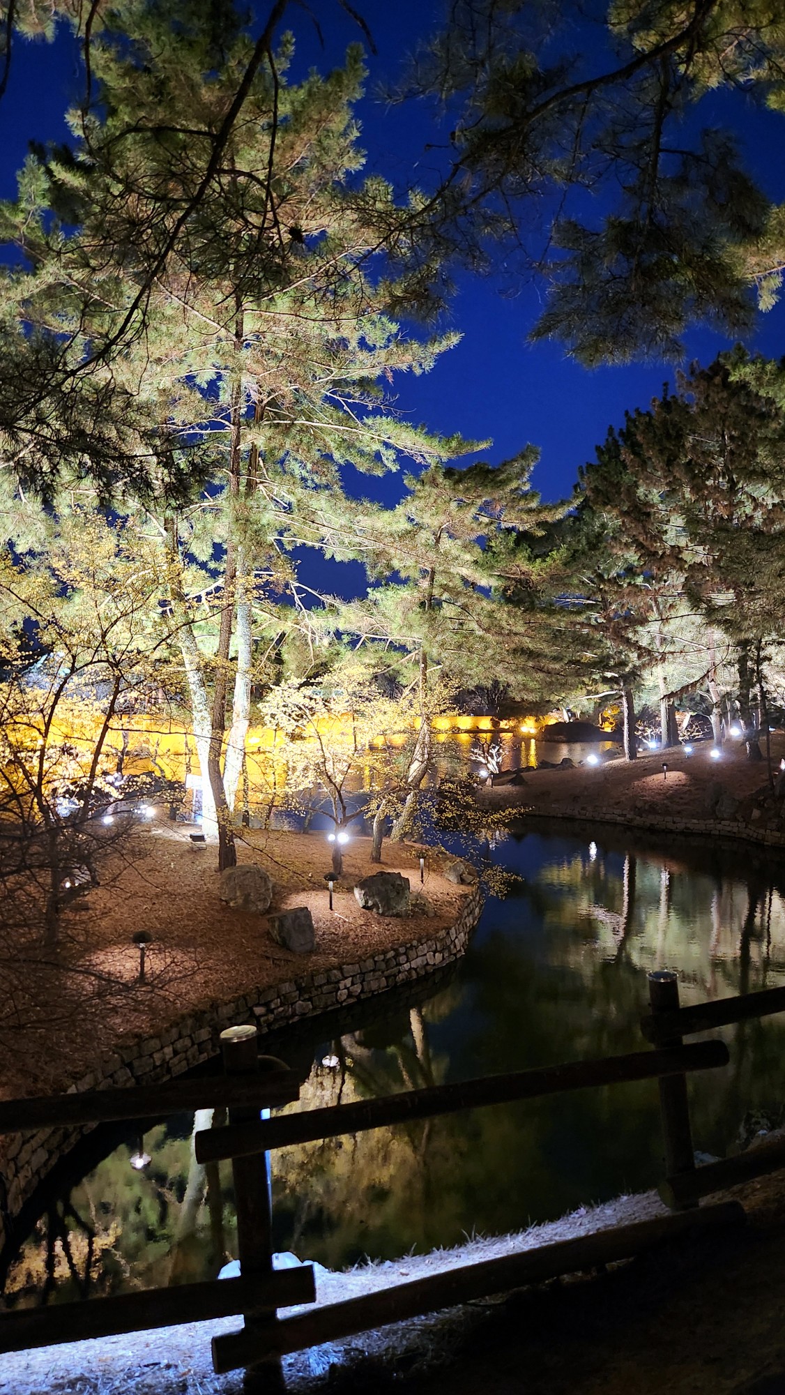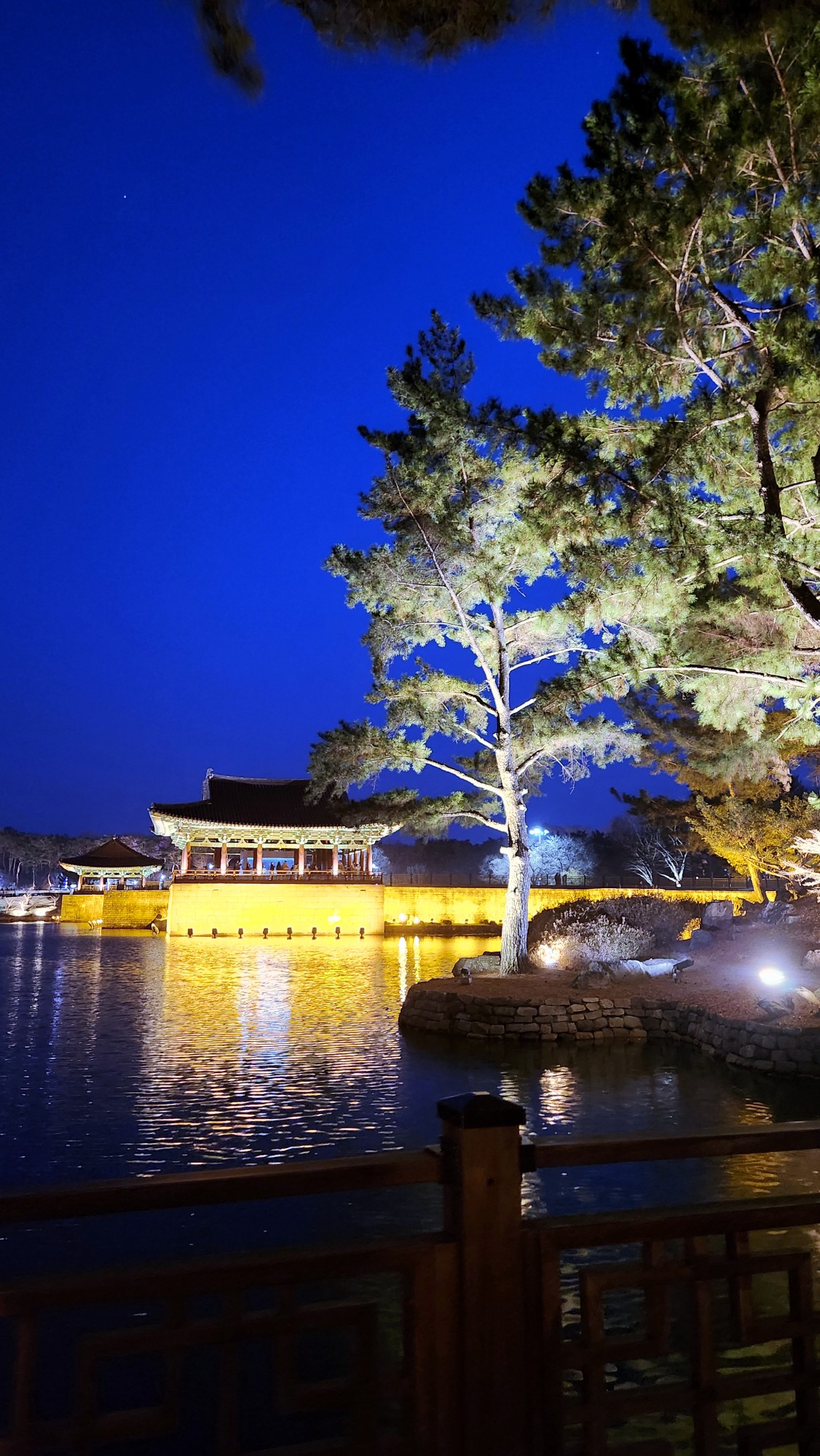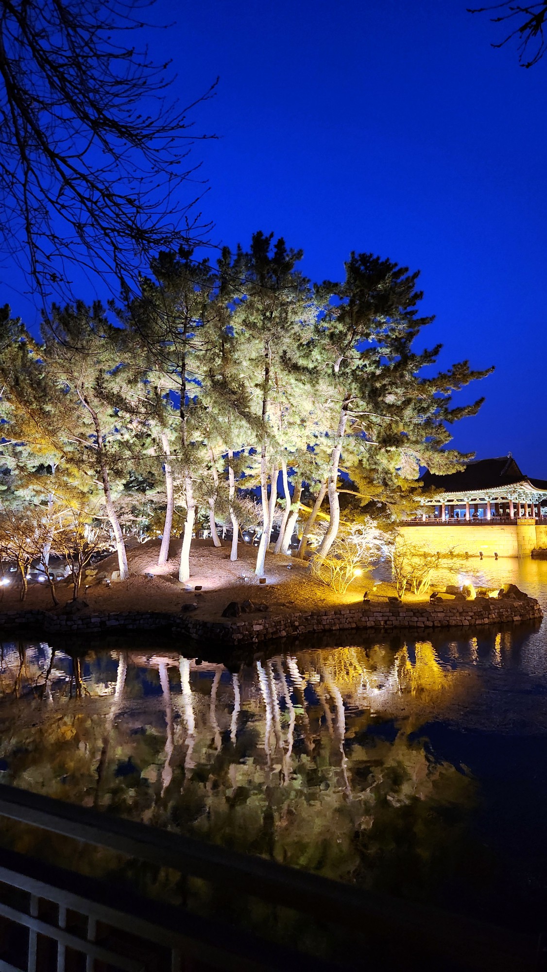 조명을 받은 소나무와 누각이 물 위에 데칼코마니처럼 찍힌 모습은 이곳에서만 볼 수 있는 장관입니다.