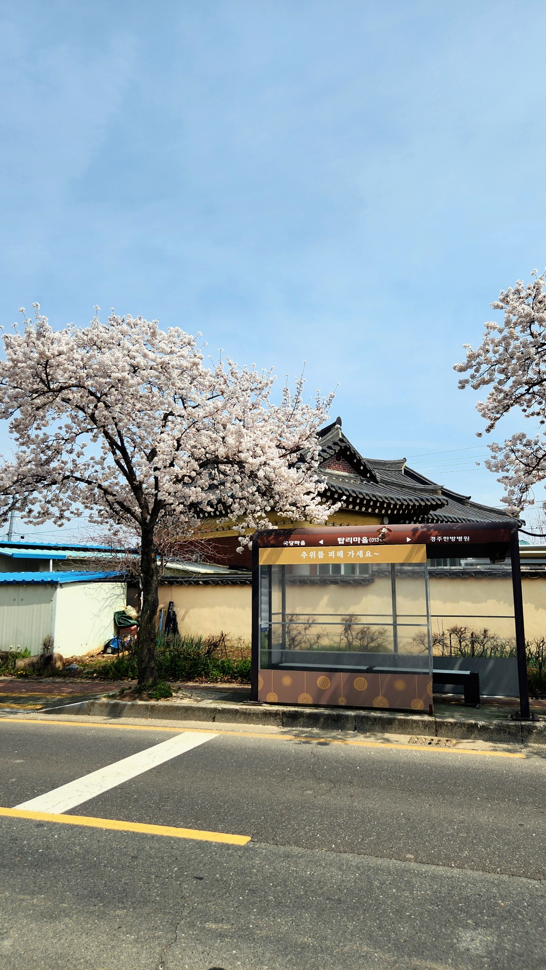 정류장 뒤편의 기와지붕과 벚나무가 어우러진 풍경은 경주에서만 볼 수 있는 독특한 미감입니다.