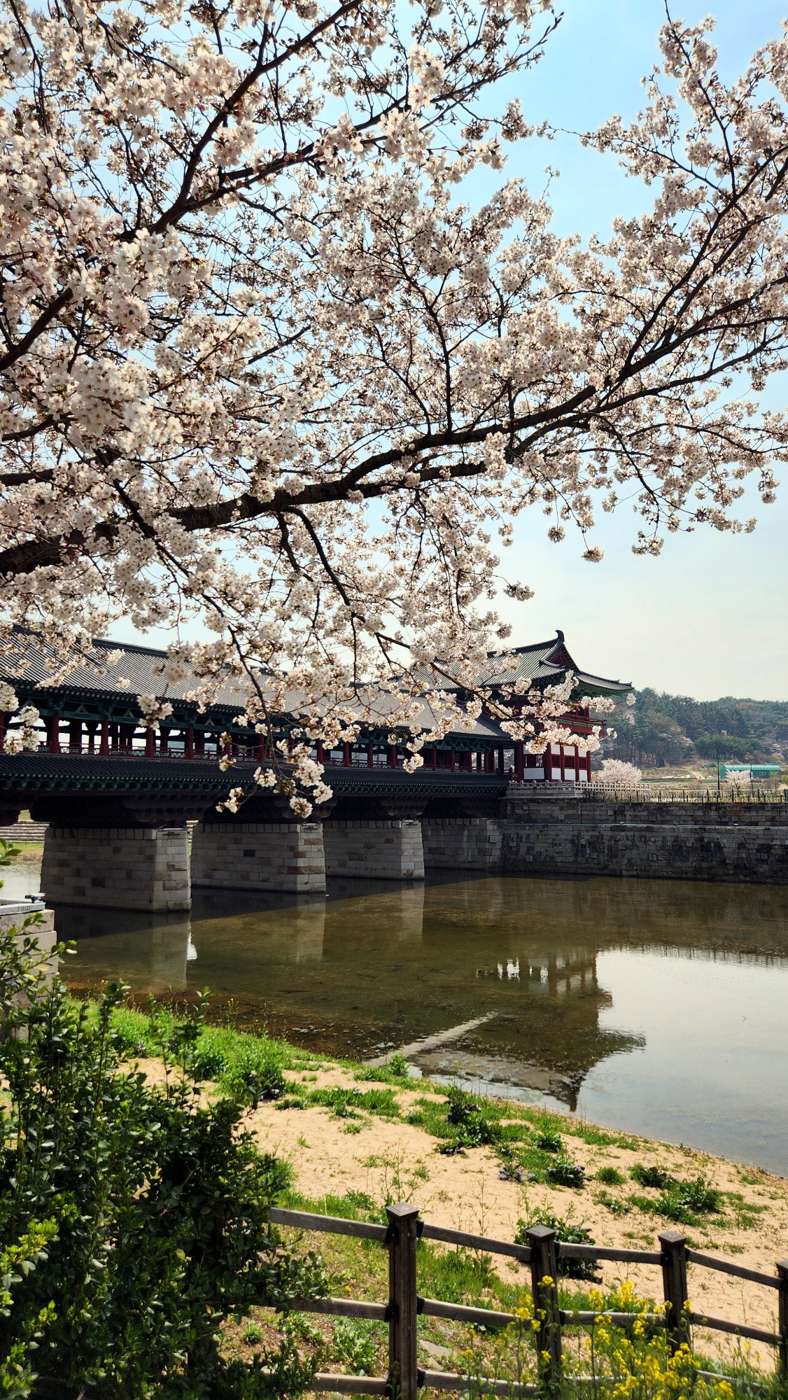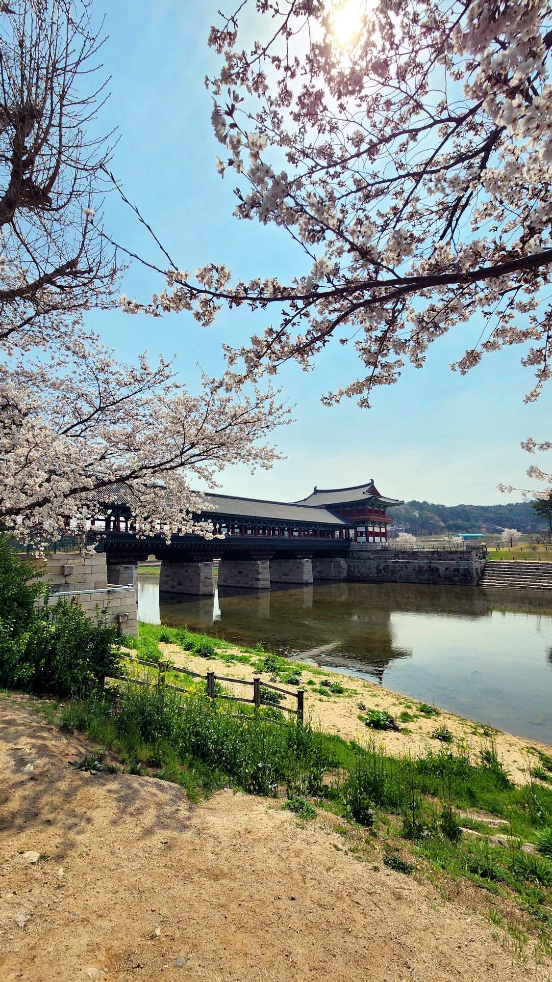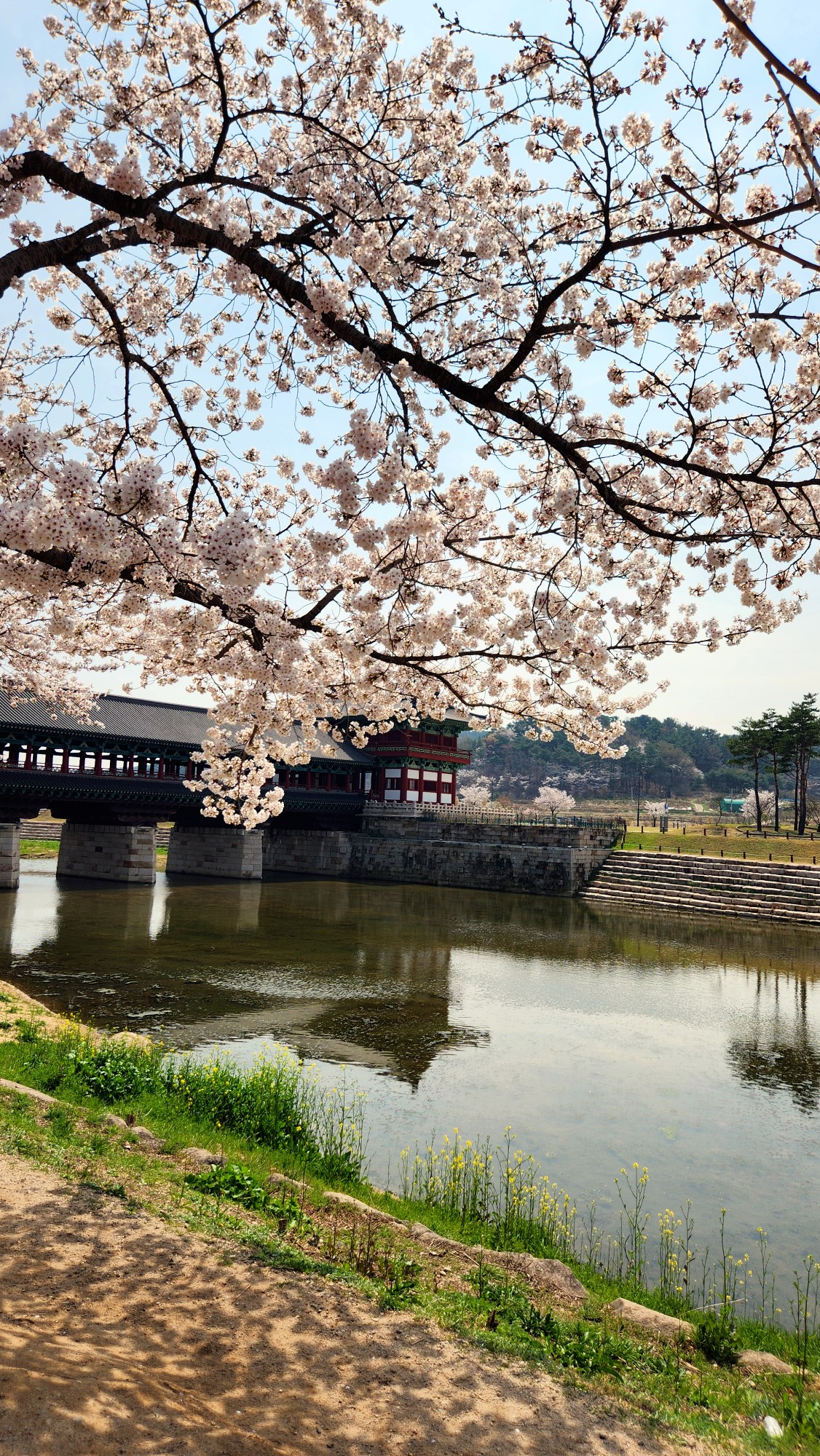 월정교 주변을 감싸 안은 벚꽃 나무들은 남천(냇물)과 어우러져 한 폭의 수채화를 그려냅니다. 잔잔한 강물에 비친 월정교의 반영(Refection)은 카메라 셔터를 멈출 수 없게 만듭니다.
