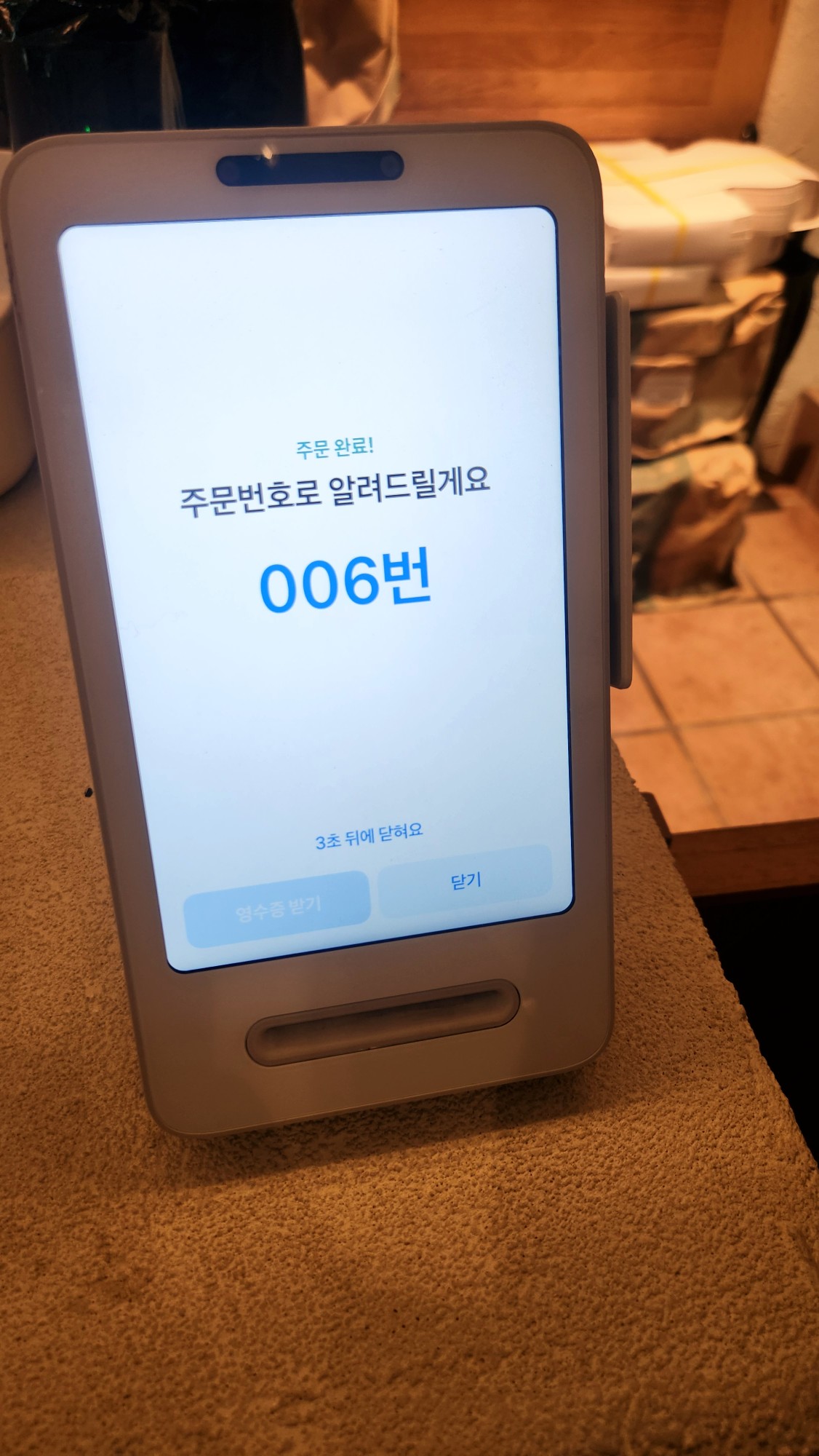 주문은 간편하게 키오스크를 통해 진행됩니다. 저는 운 좋게도 006번이라는 빠른 번호를 받았는데요.