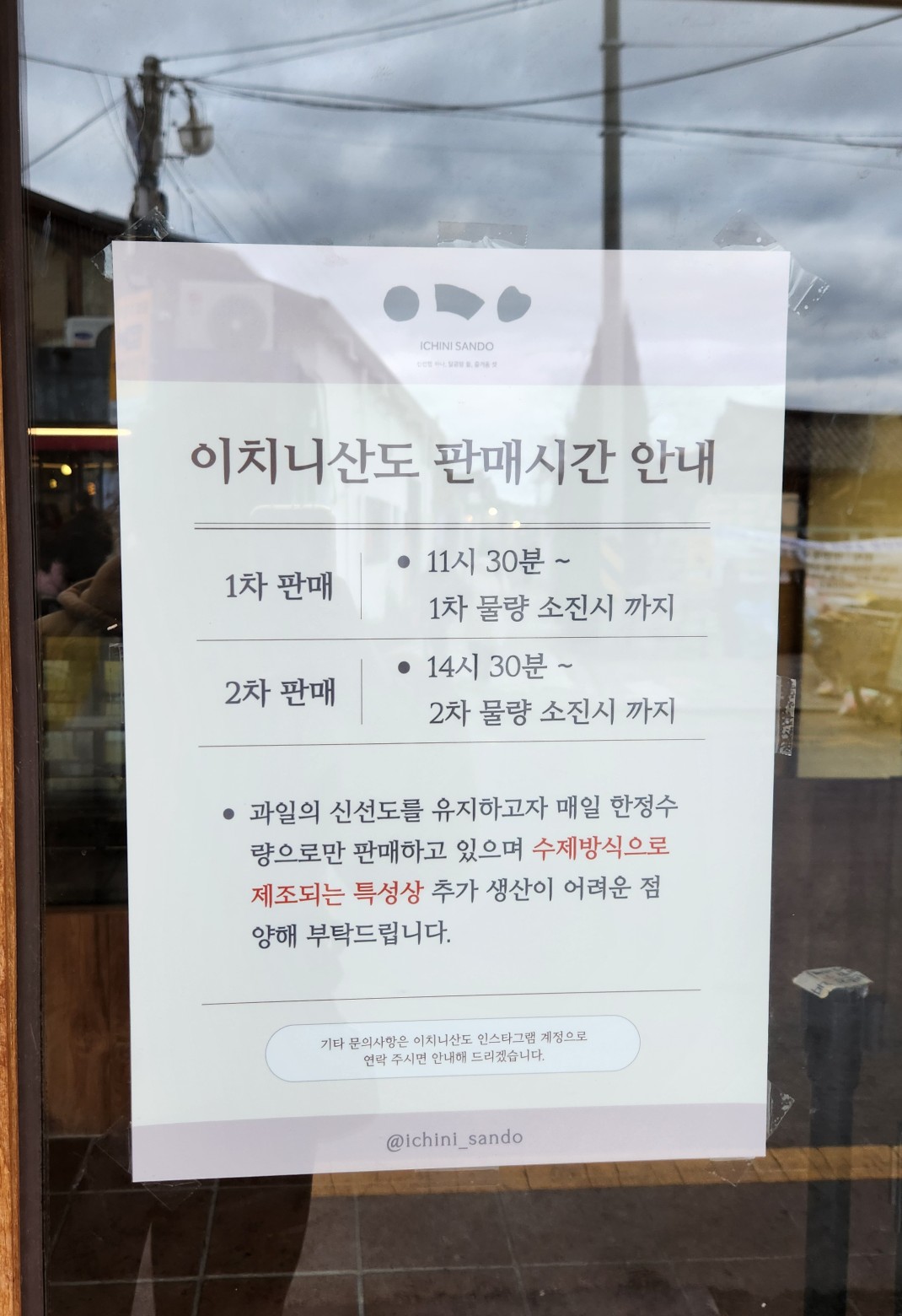 인스타그램 확인당일 조기 품절 정보나 휴무 안내는 공식 인스타그램(@ichini_sando)을 통해 공지되니 방문 전 확인은 필수입니다.