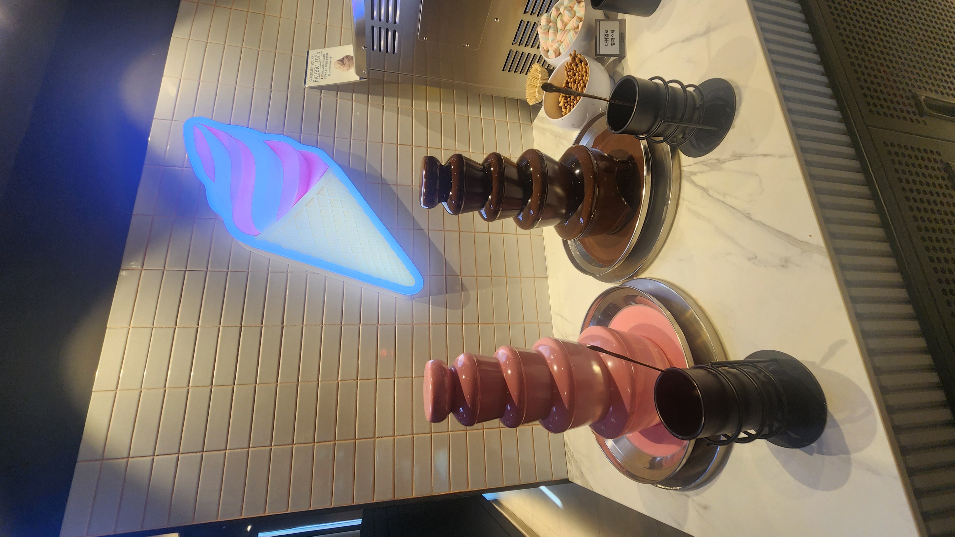 * 초코 분수: 핑크빛 딸기 초코와 진한 다크 초코 분수가 흐르고 있어 마시멜로나 스틱 과자를 찍어 먹는 재미가 쏠쏠합니다.