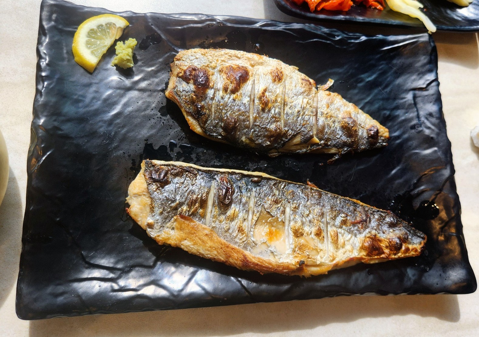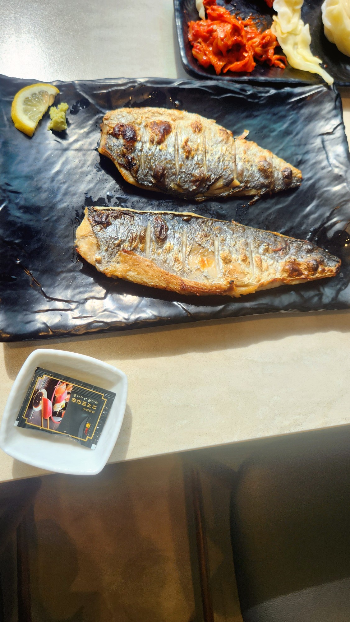 생선구이는 비린내 없이 아주 담백하게 구워져 나옵니다. 껍질은 바삭하고 속살은 촉촉하게 유지되어 있어 고추냉이를 살짝 푼 간장에 찍어 먹으면 밥 한 그릇 뚝딱입니다.
