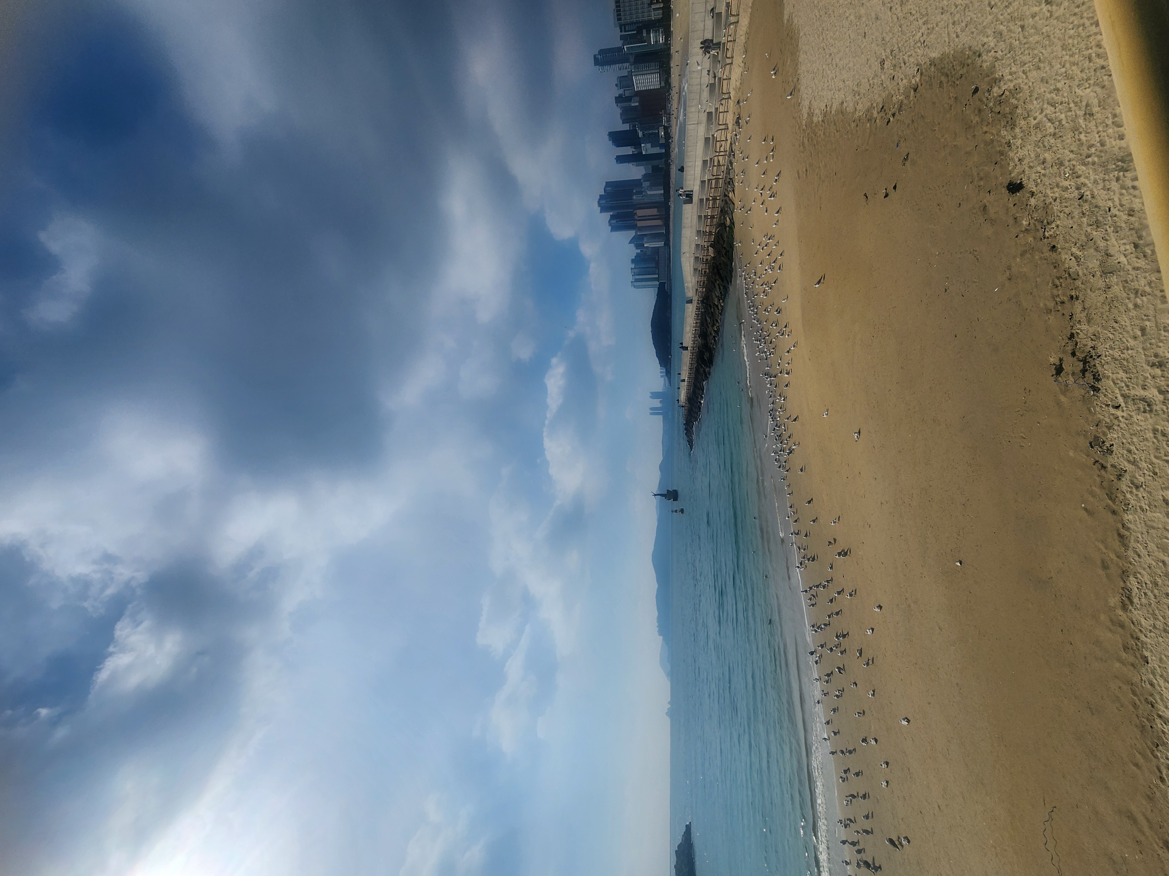 넓게 펼쳐진 백사장에는 수많은 갈매기가 모여 있어 이국적인 풍경을 연출합니다.
