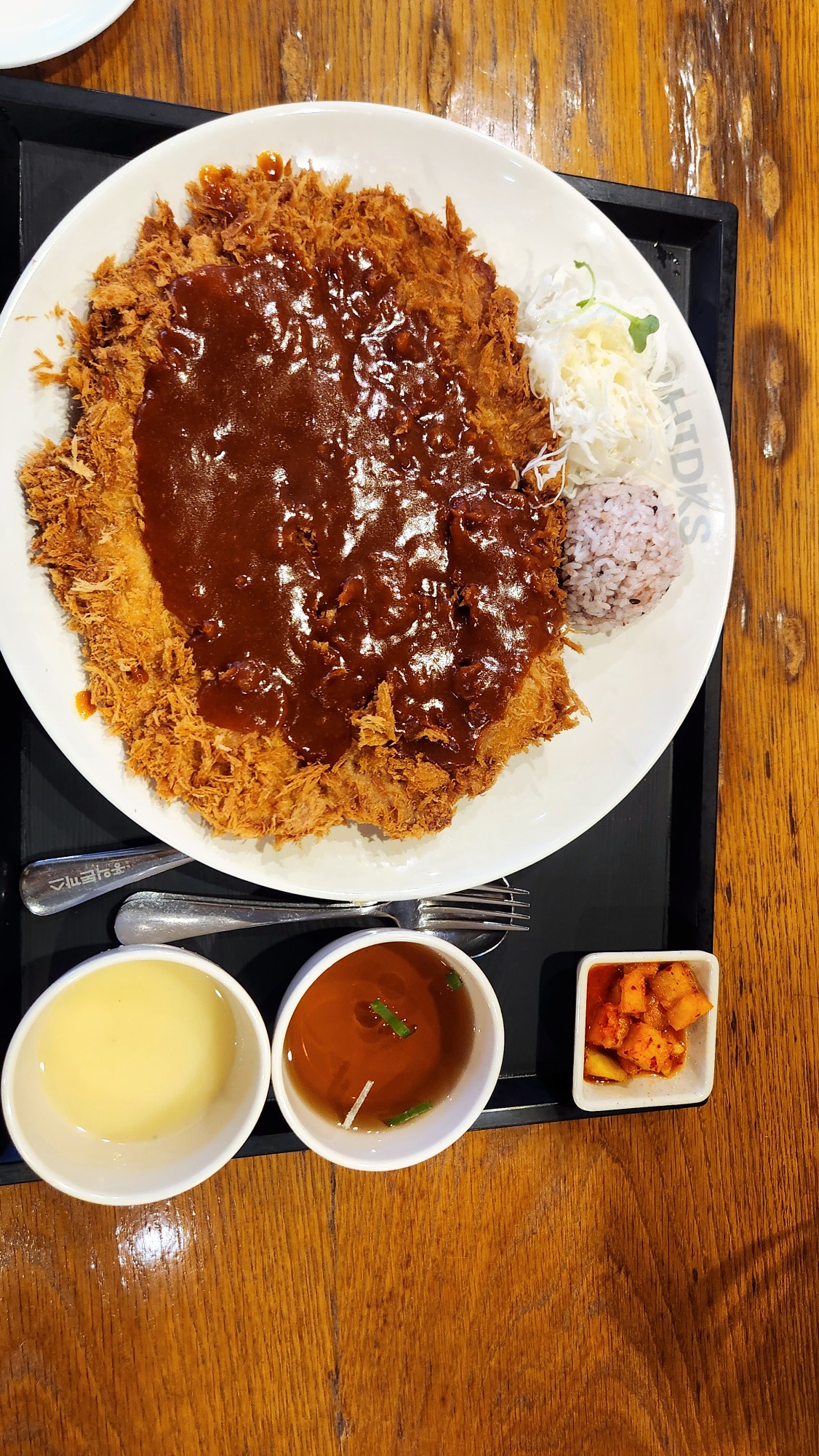 후추를 톡톡 뿌린 스프 한 모금에 돈까스 한 점이면 세상을 다 가진 기분이죠.