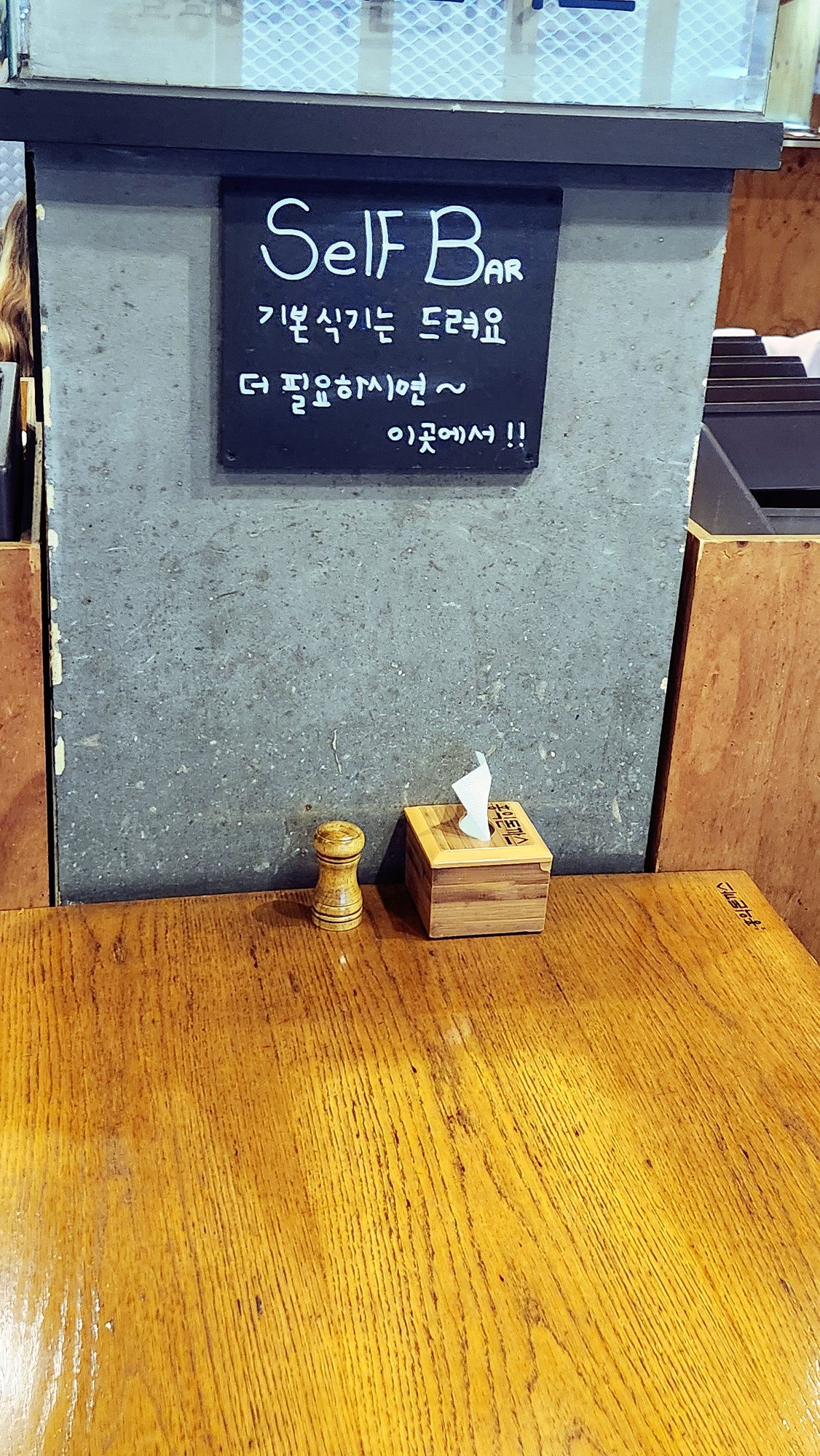 매장 중앙에는 Self Bar가 마련되어 있습니다. 기본 식기 외에 추가로 필요한 포크나 나이프 아이용 수저 등을 자유롭게 가져올 수 있어 편리했어요.