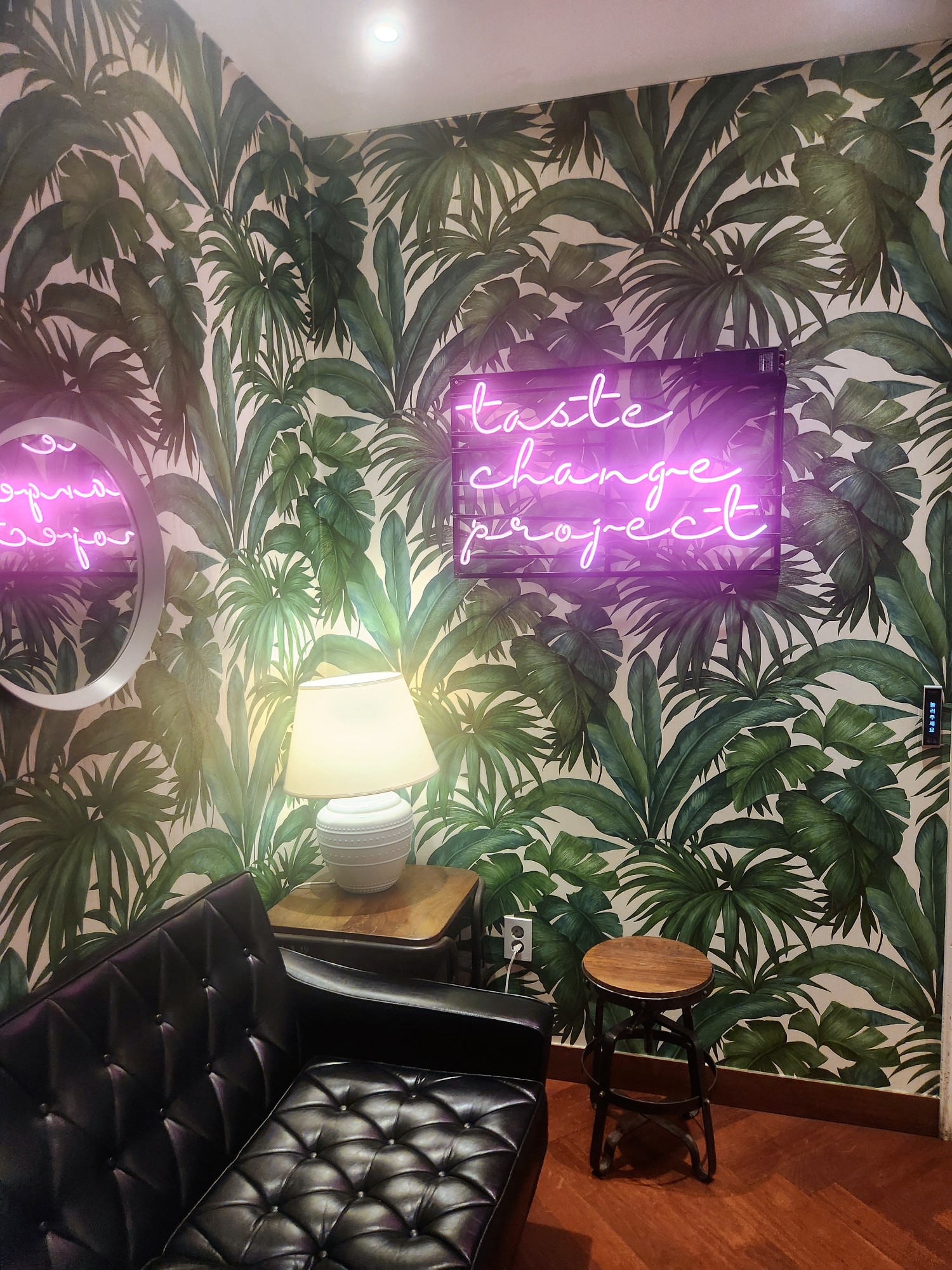 벽면에 장식된 Taste Change Project라는 네온사인과 이국적인 보태니컬 벽지가 눈길을 사로잡았습니다.