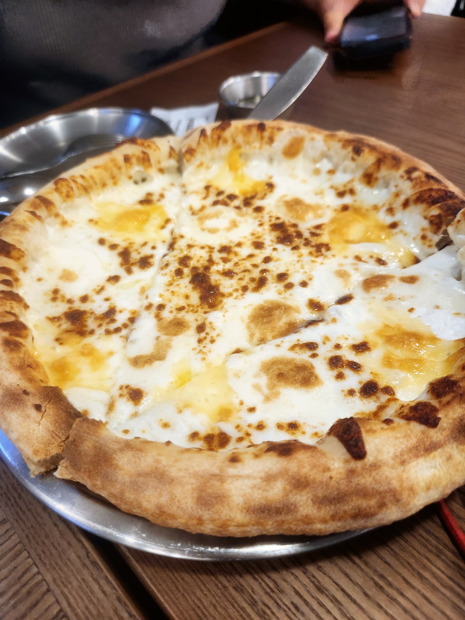 다섯 가지 종류의 프리미엄 치즈가 도우 위를 빈틈없이 덮고 있다 못해 옆으로 흘러내릴 듯한 비주얼은 압권이었어요.