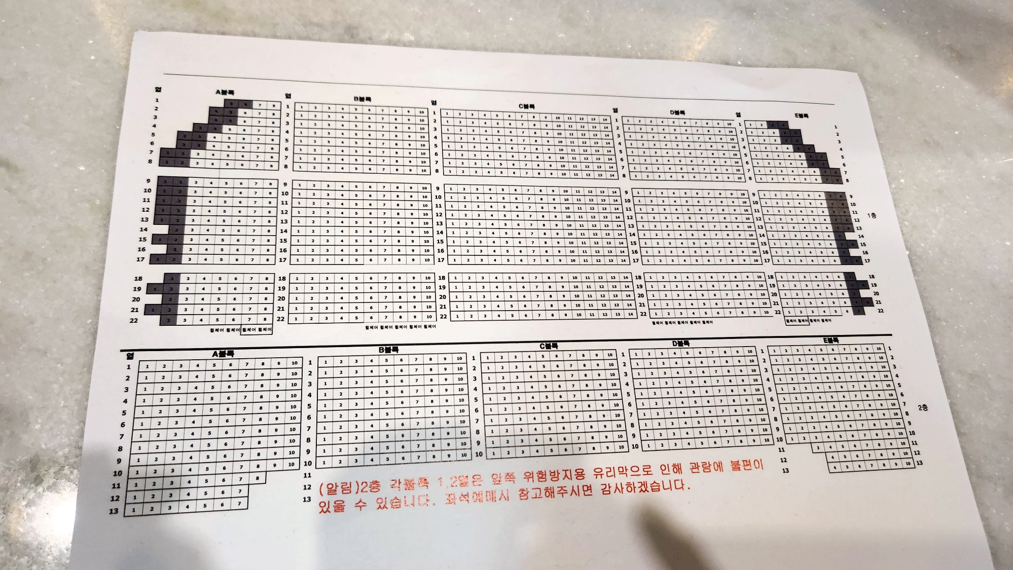 * 2층 시야 방해 주의 2층 앞줄(1, 2열)은 안전을 위한 유리 난간 때문에 시야 방해가 발생할 수 있다는 안내가 있습니다.