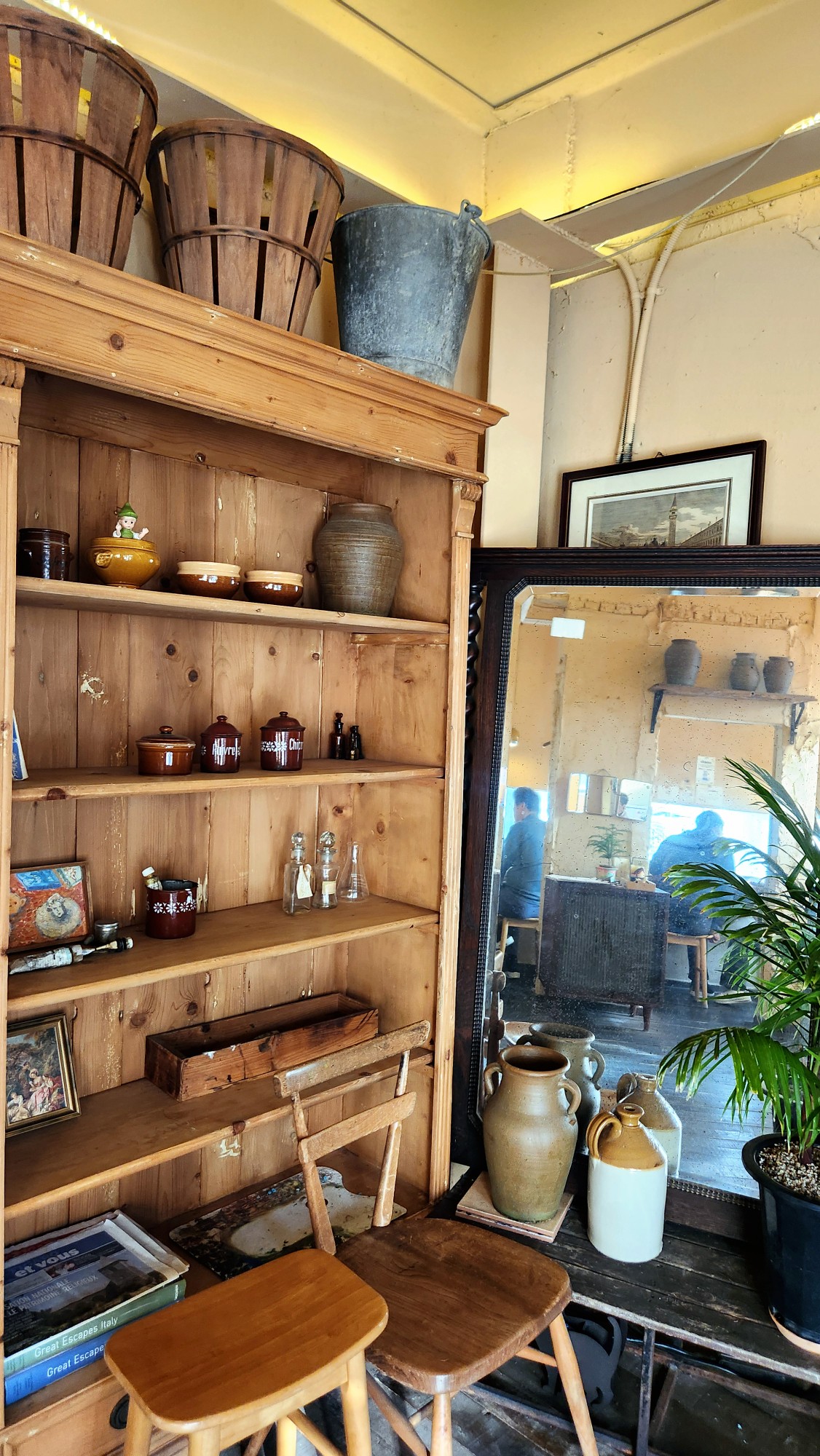 한쪽 벽면을 채운 나무 선반에는 투박한 토기들과 아기자기한 주방 소품들이 놓여 있어 마치 프랑스 시골 마을의 가정집에 초대받은 기분이 듭니다. 창가 쪽에 배치된 큰 거울은 공간을 더 넓어 보이게 하면서도 방문 인증샷을 남기기에 더할 나위 없는 포토존이 되어주네요.