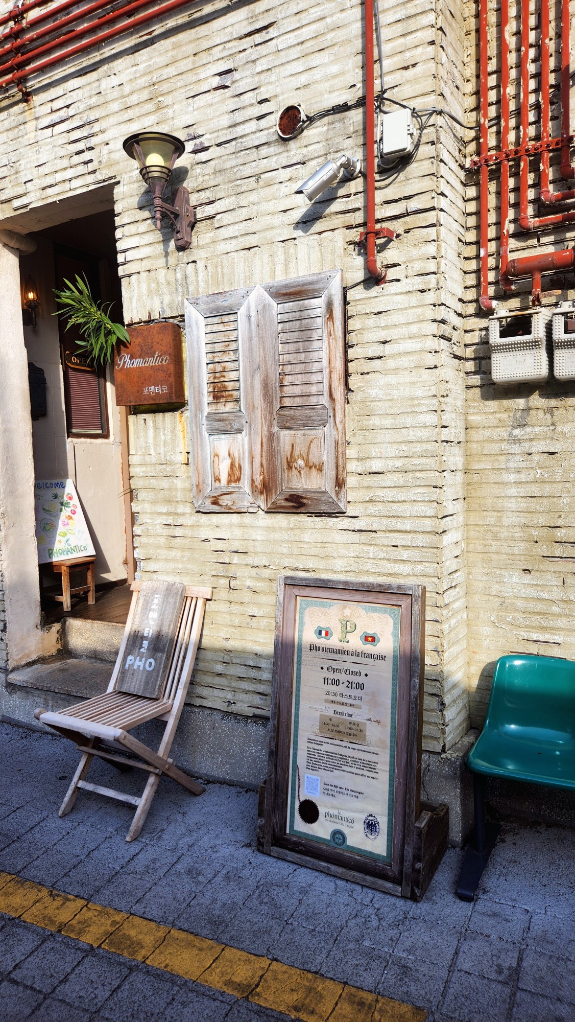 입구 옆 빈티지한 입간판에는 영업시간(11:00 ~ 21:00)과 브레이크 타임이 안내되어 있어 정성스레 가꾸어진 유럽의 노천카페 같은 느낌을 줍니다.