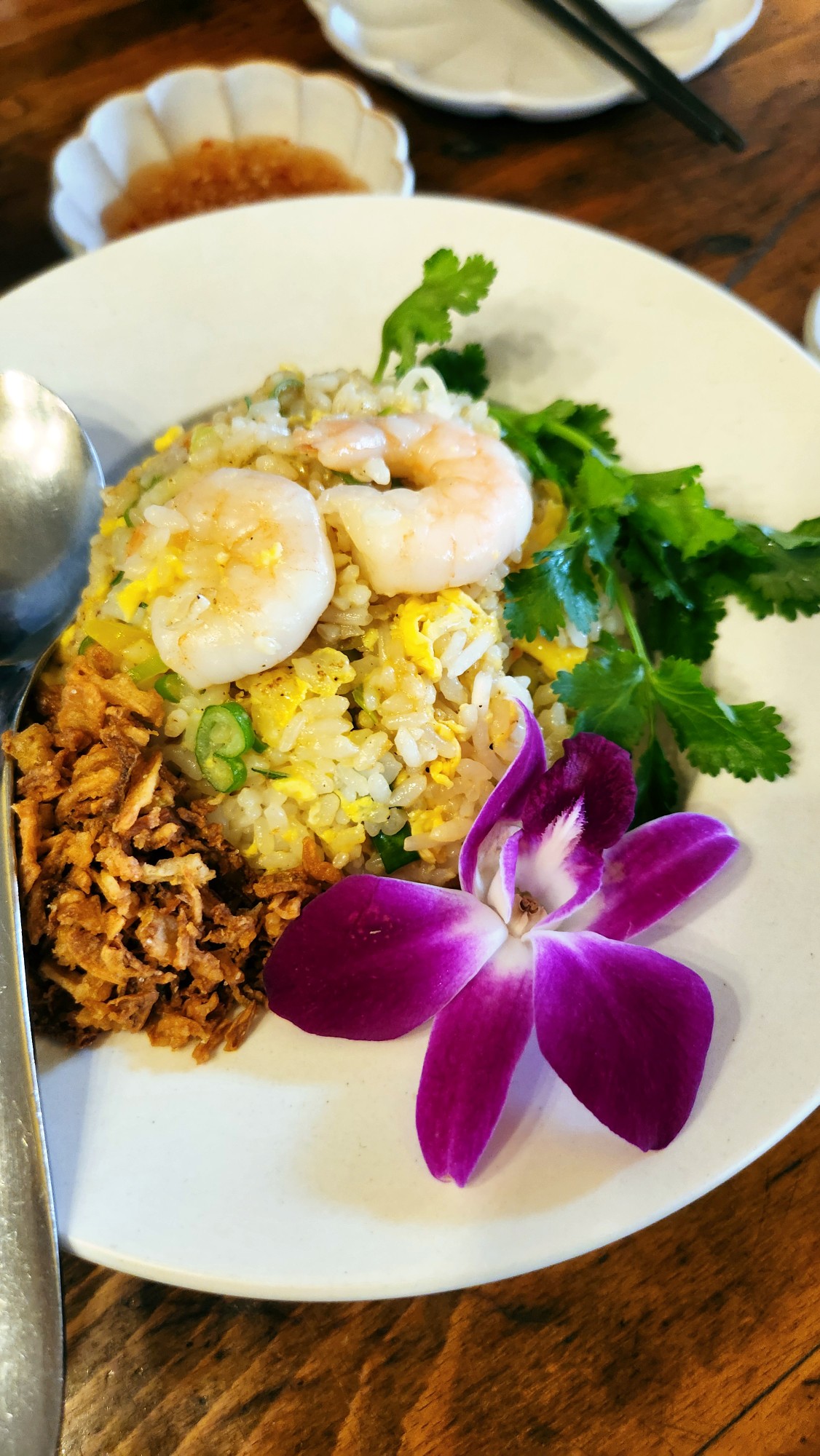 큼직한 새우와 식용 꽃 고수 바삭한 마늘 후레이크가 곁들여져 있습니다.