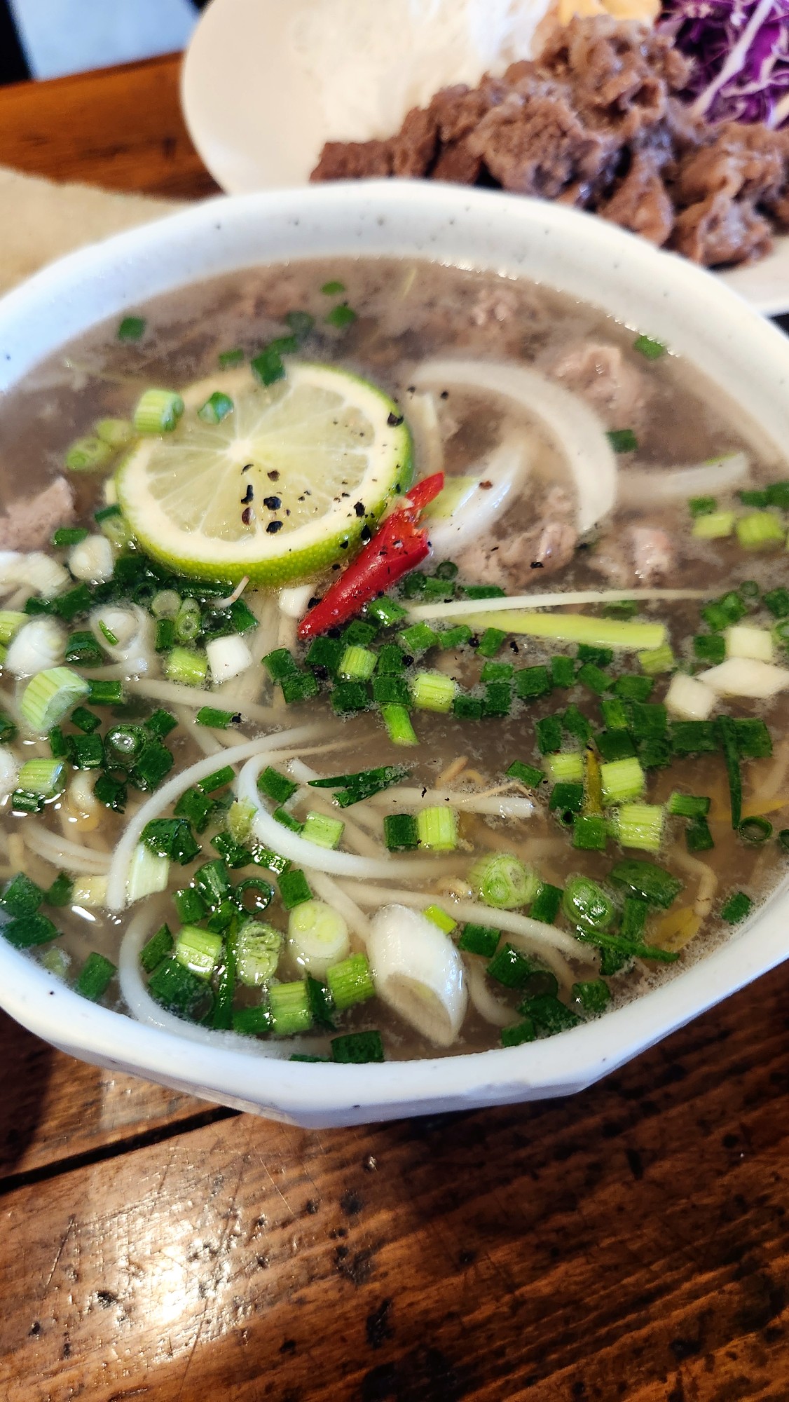 포토푀 오리지널 사골쌀국수 맑으면서도 깊은 빛을 띠는 육수 위에 신선한 쪽파와 라임 홍고추가 올라가 있습니다.