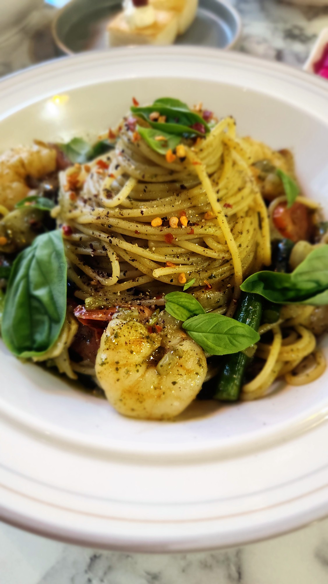 통통한 새우가 넉넉히 들어있고 바질 특유의 향긋함이 입안 가득 퍼집니다.