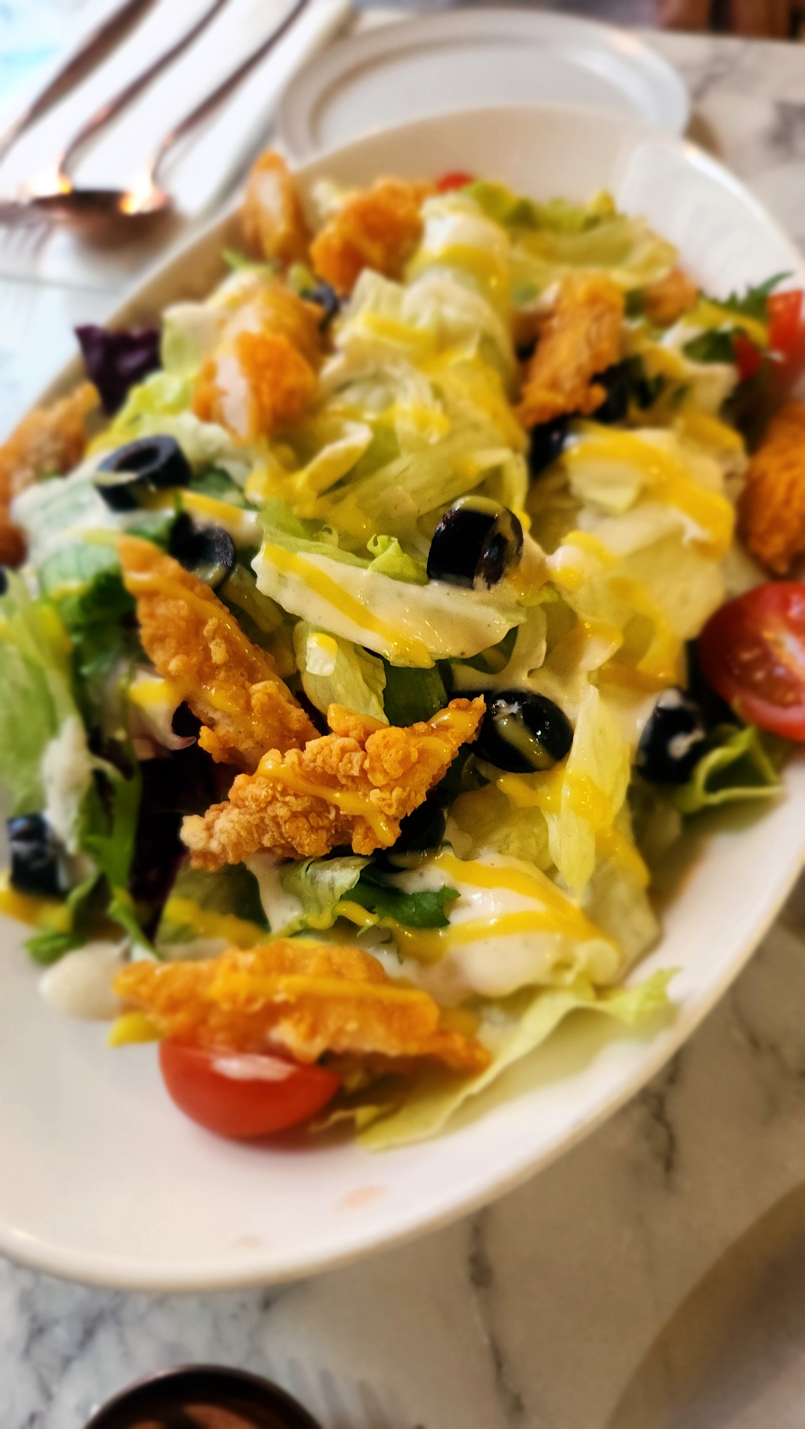신선함이 살아있는 야채 위에 바삭하게 튀겨낸 치킨 텐더가 듬뿍 올라가 있습니다.
