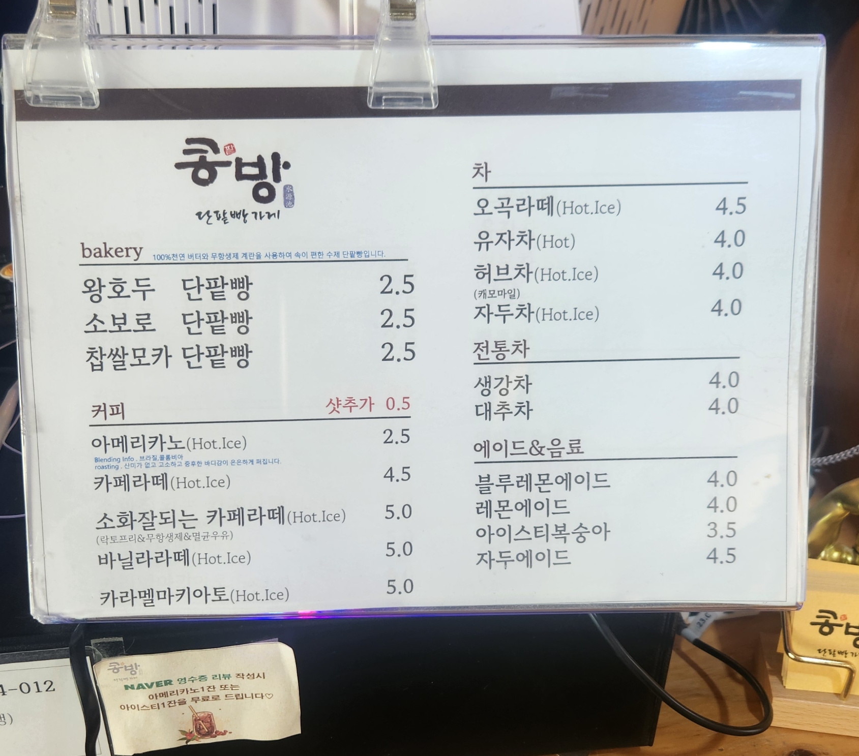 이곳의 대표 메뉴는 단연 단팥빵입니다. 메뉴가 다양하지 않다는 점이 오히려 신뢰를 높입니다. 하나의 메뉴에 집중하여 완성도를 끌어올렸다는 느낌을 받았습니다.