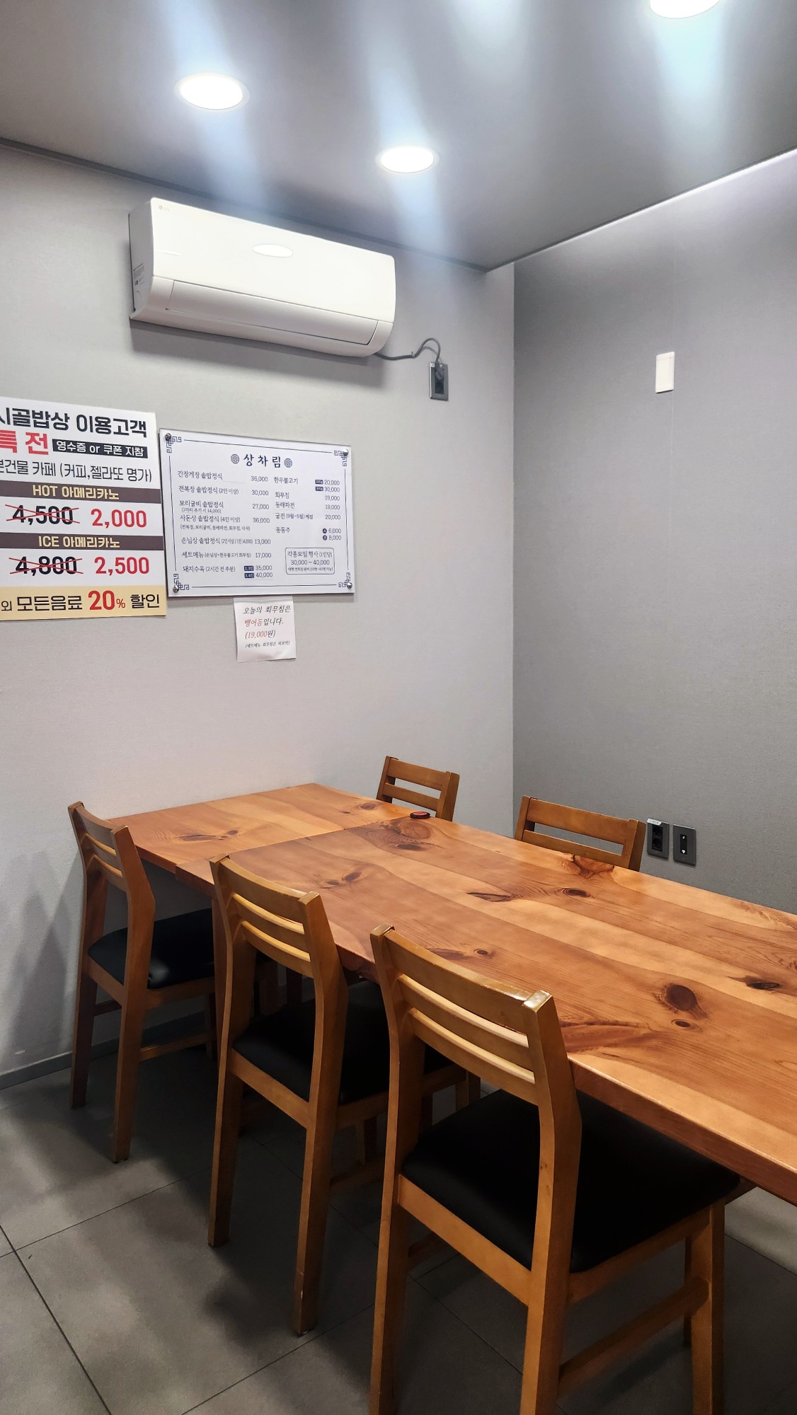 식당 내부로 들어서면 외관의 전통적인 느낌과는 또 다른 현대적이고 깔끔한 공간이 펼쳐집니다. 통창을 통해 들어오는 채광이 우드톤의 테이블과 어우러져 편안한 식사 분위기를 조성합니다.