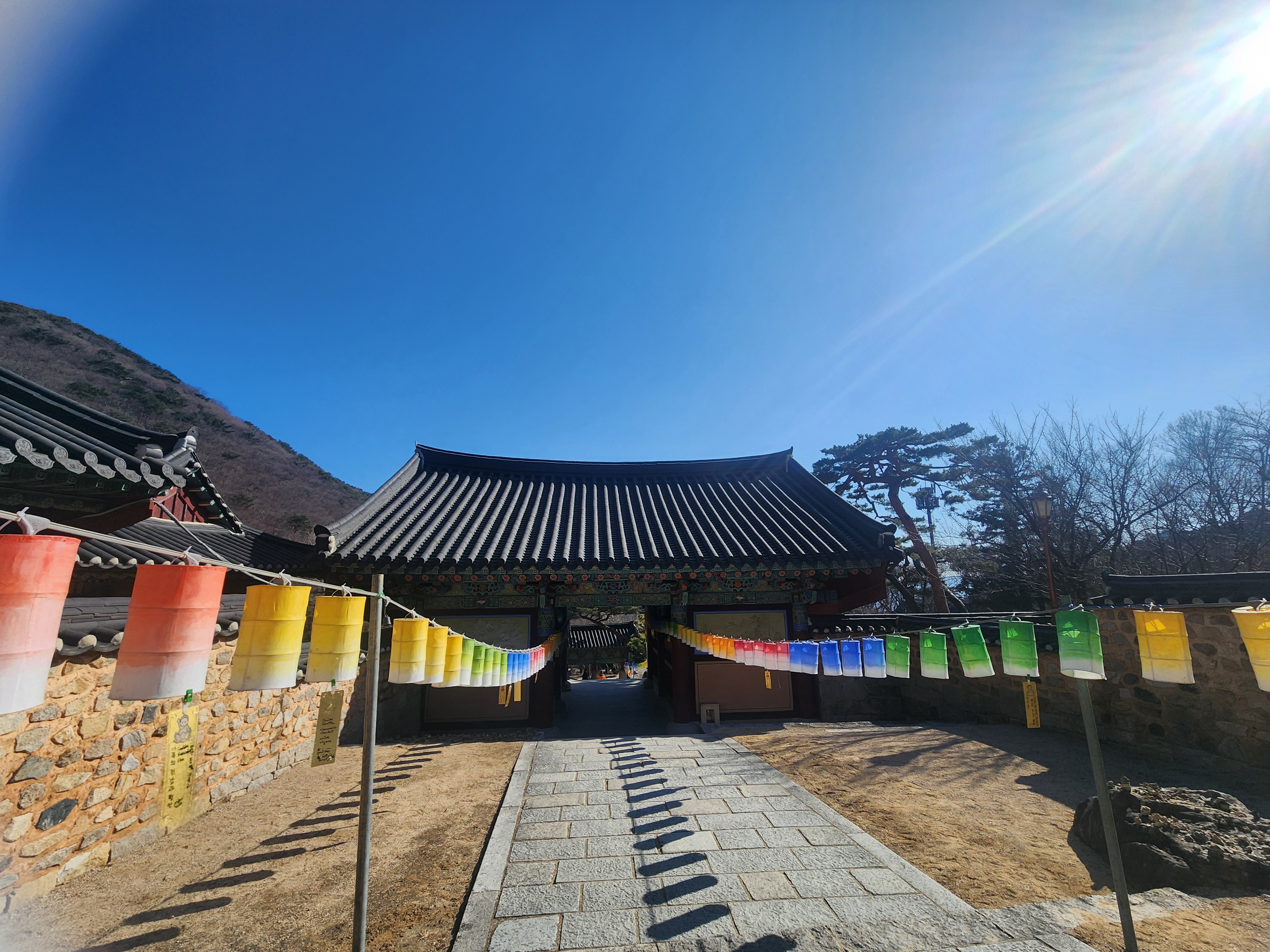 이 맑은 하늘을 배경으로 알록달록한 연등들이 줄지어 걸려 있는데 그 모습이 정말 장관이었습니다.