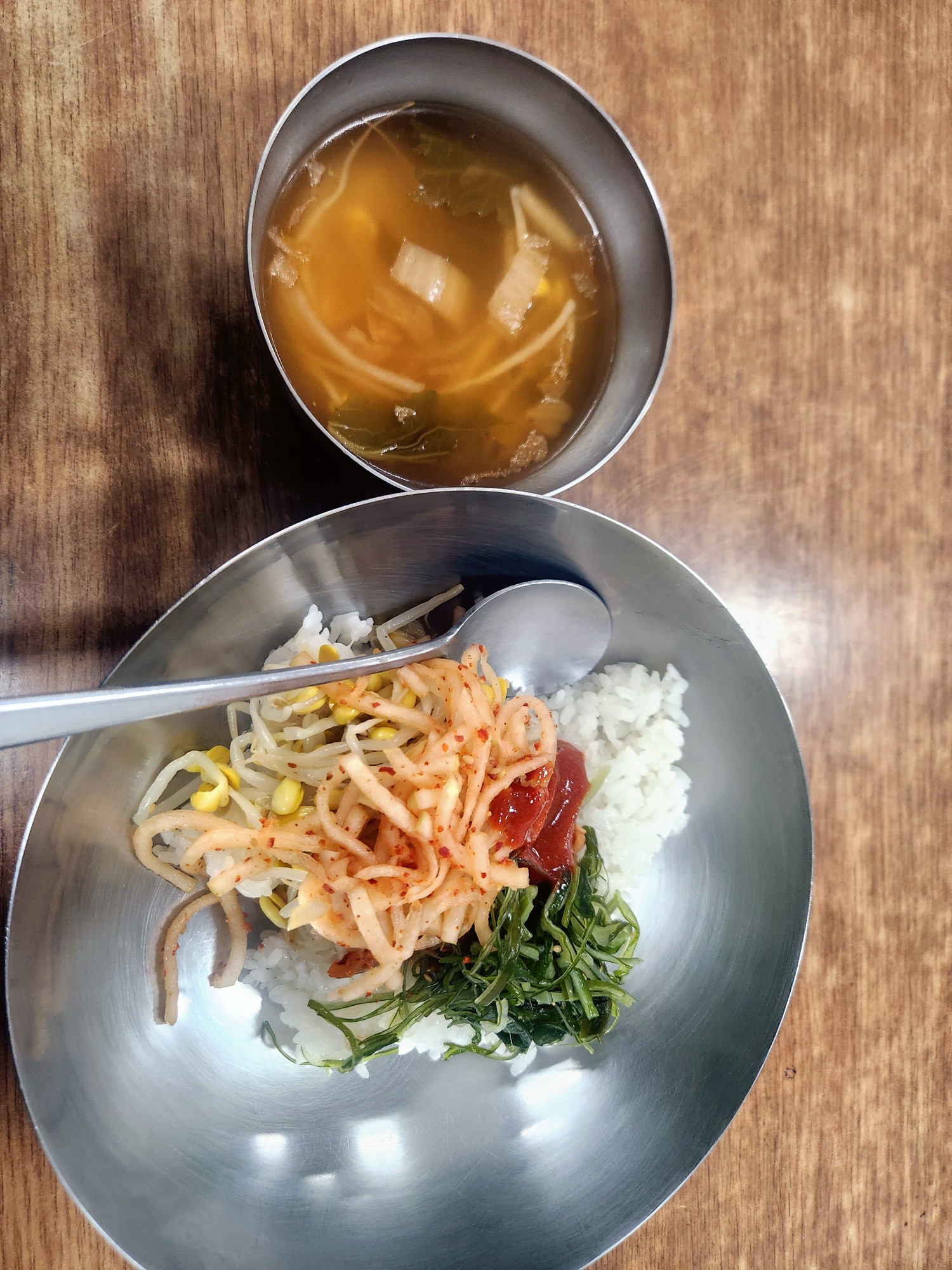 오늘의 메뉴는 신선한 나물을 듬뿍 넣은 나물 비빔밥과 따뜻한 국이었습니다.