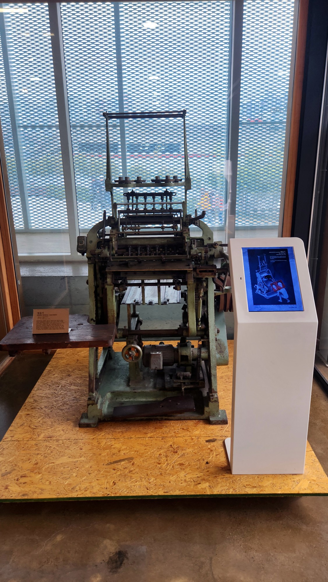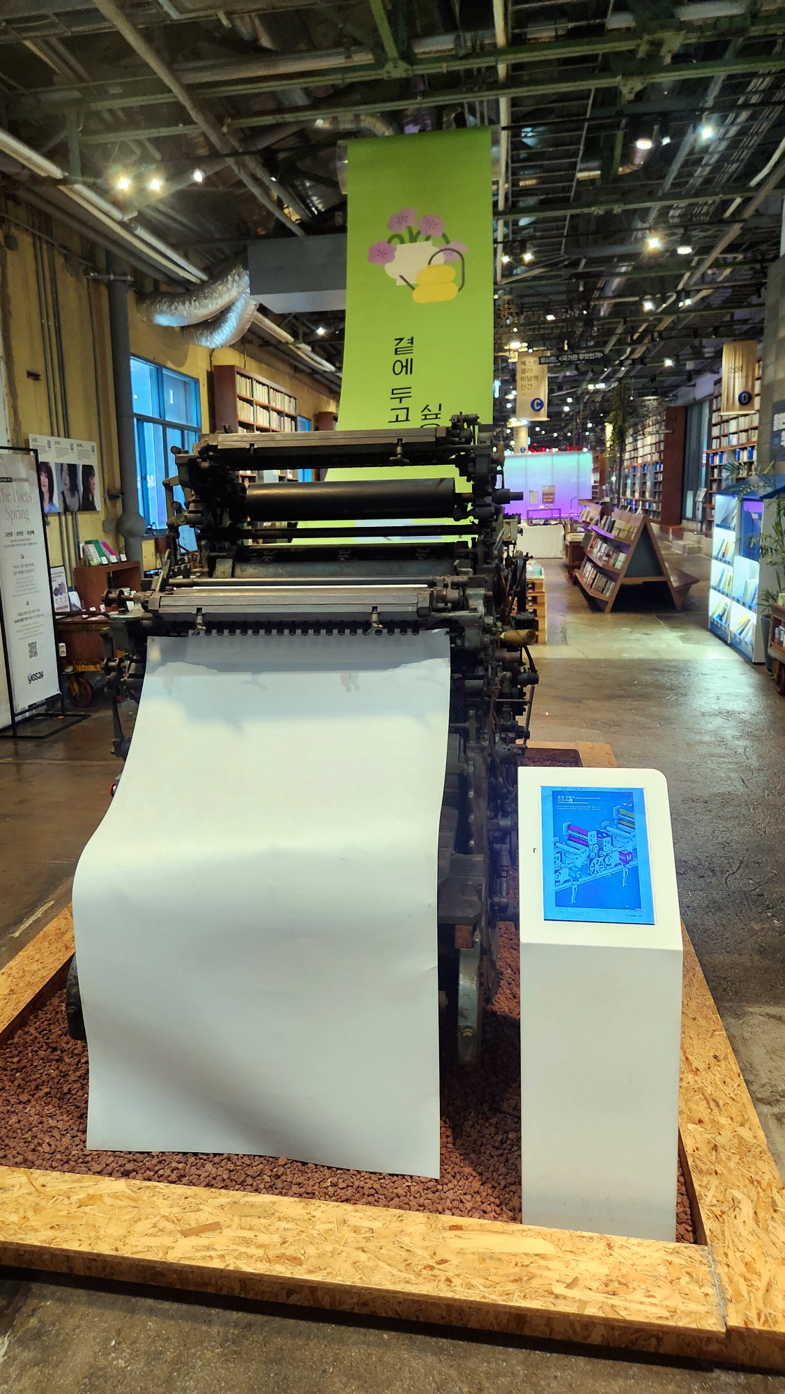천장에 노출된 거친 배관들 그리고 전시장 한편을 차지한 빈티지 인쇄 기계와 제본 기계들이 그것입니다.
