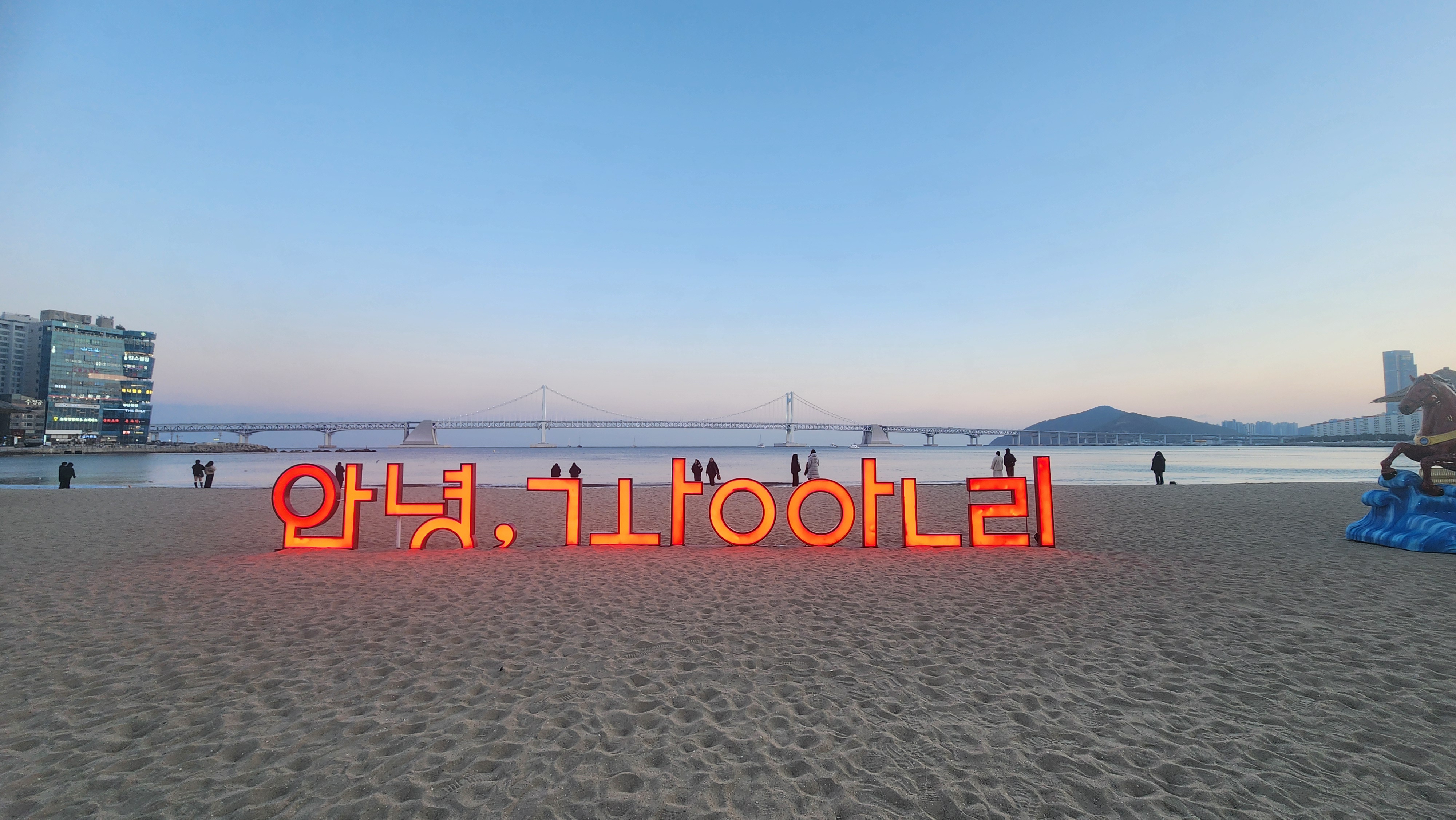 해변에 도착하자마자 가장 먼저 눈에 띈 건 강렬한 레드 컬러의 '안녕, 광안리' 조형물이었어요.