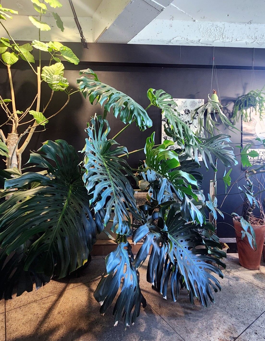 차가운 금속 질감의 인테리어와 대비되는 거대한 몬스테라와 초록 식물들은 공간에 생명력을 불어넣습니다.