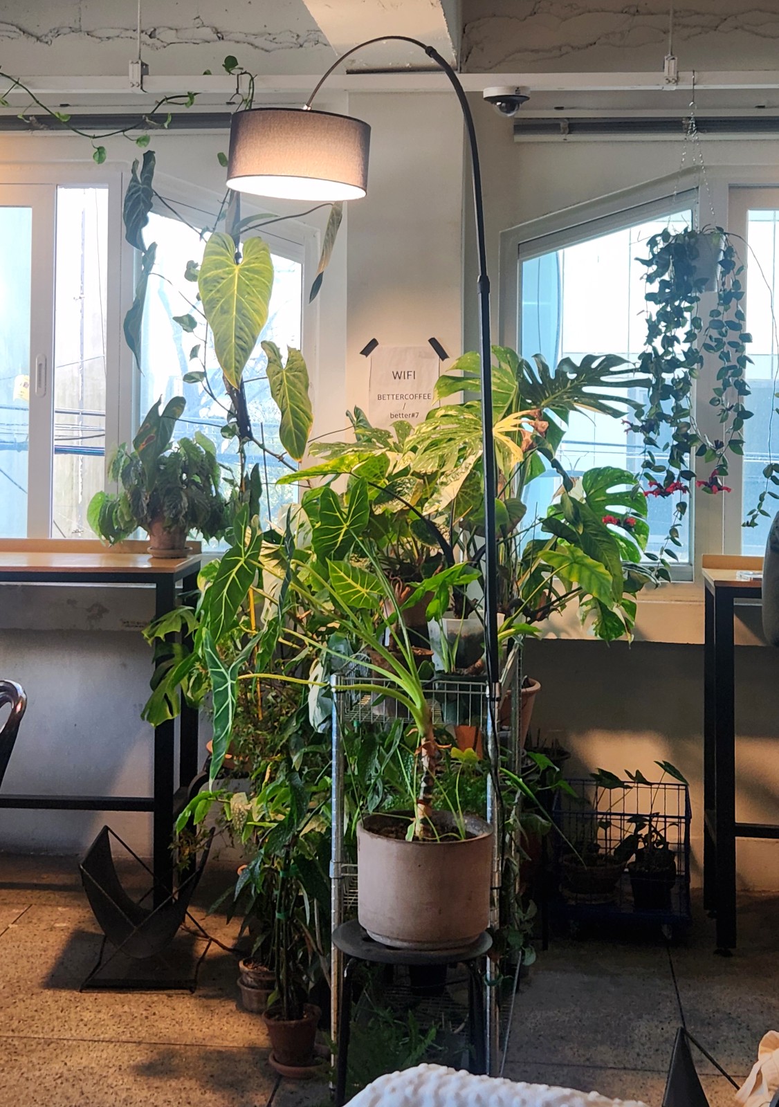 통창으로 들어오는 햇살과 식물들이 어우러져 마치 갤러리나 온실에 온 듯한 착각을 불러일으킵니다.