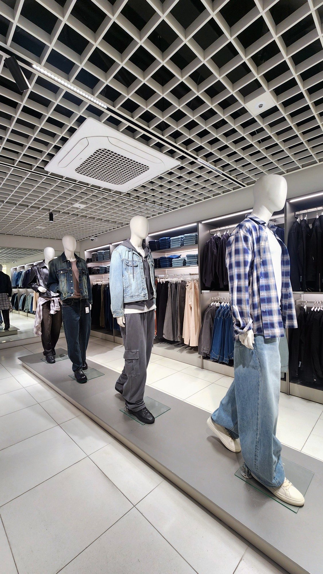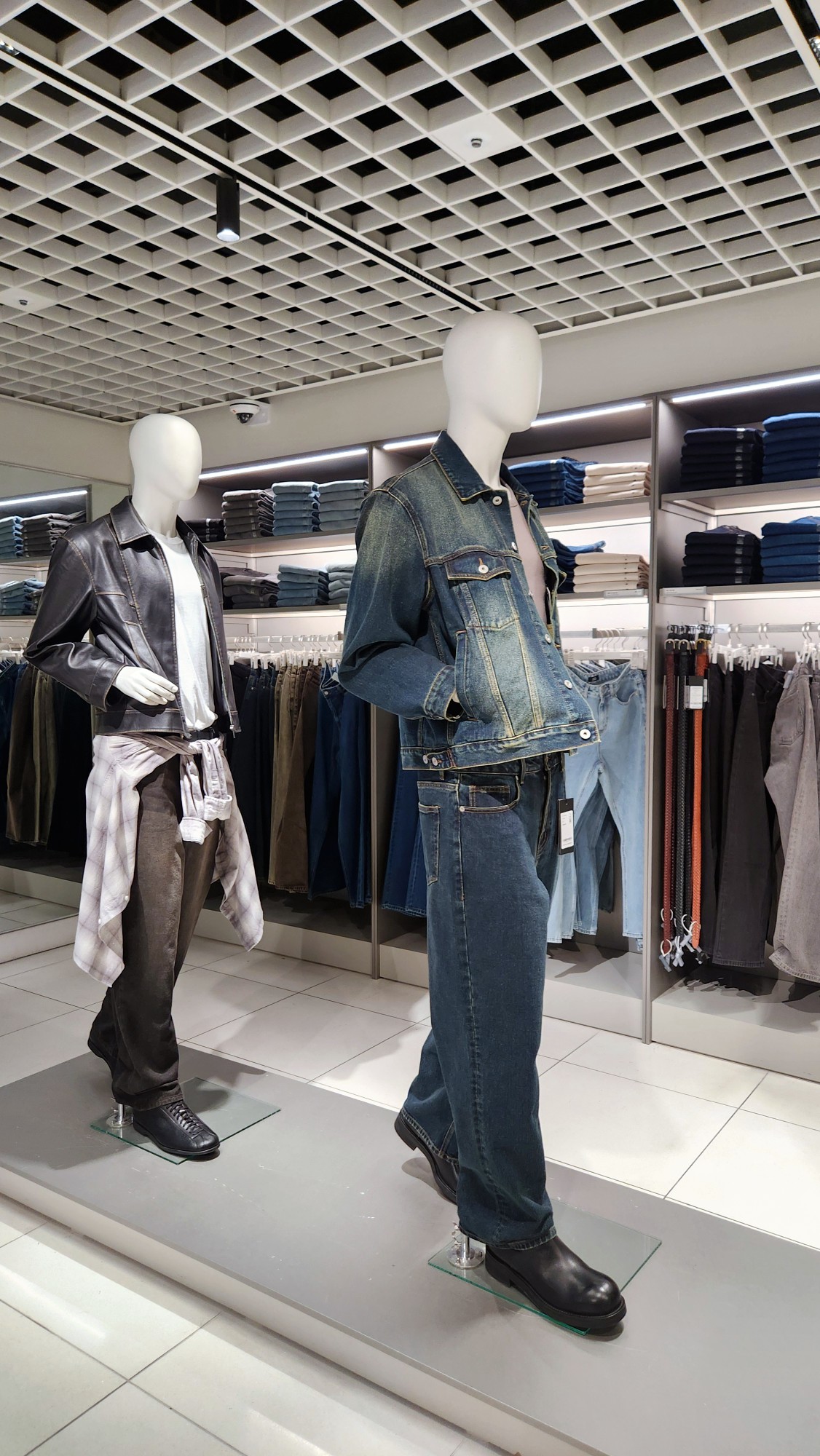 매장 안쪽 데님 셔츠와 와이드 데님 팬츠를 착용한 마네킹들