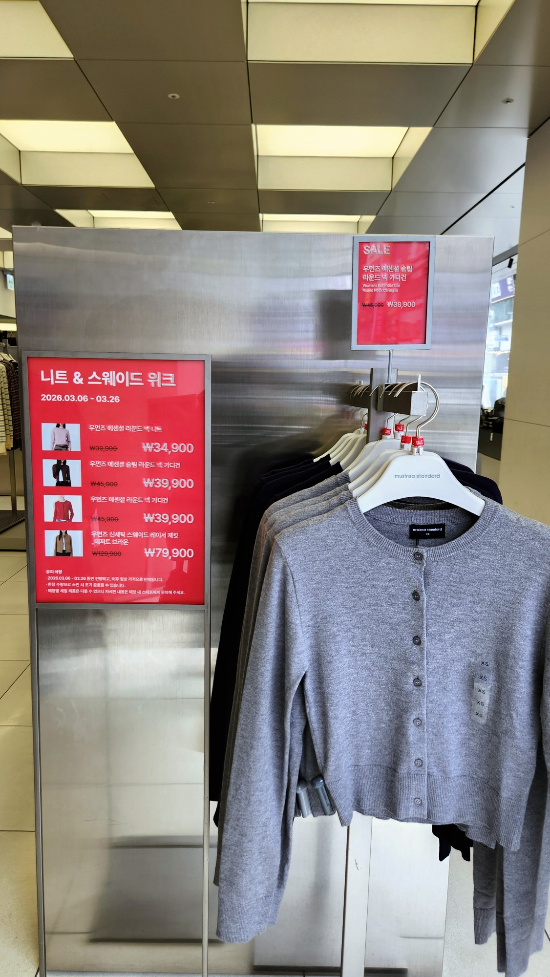 니트 & 스웨이드 위크 세일 안내판과 그레이 가디건