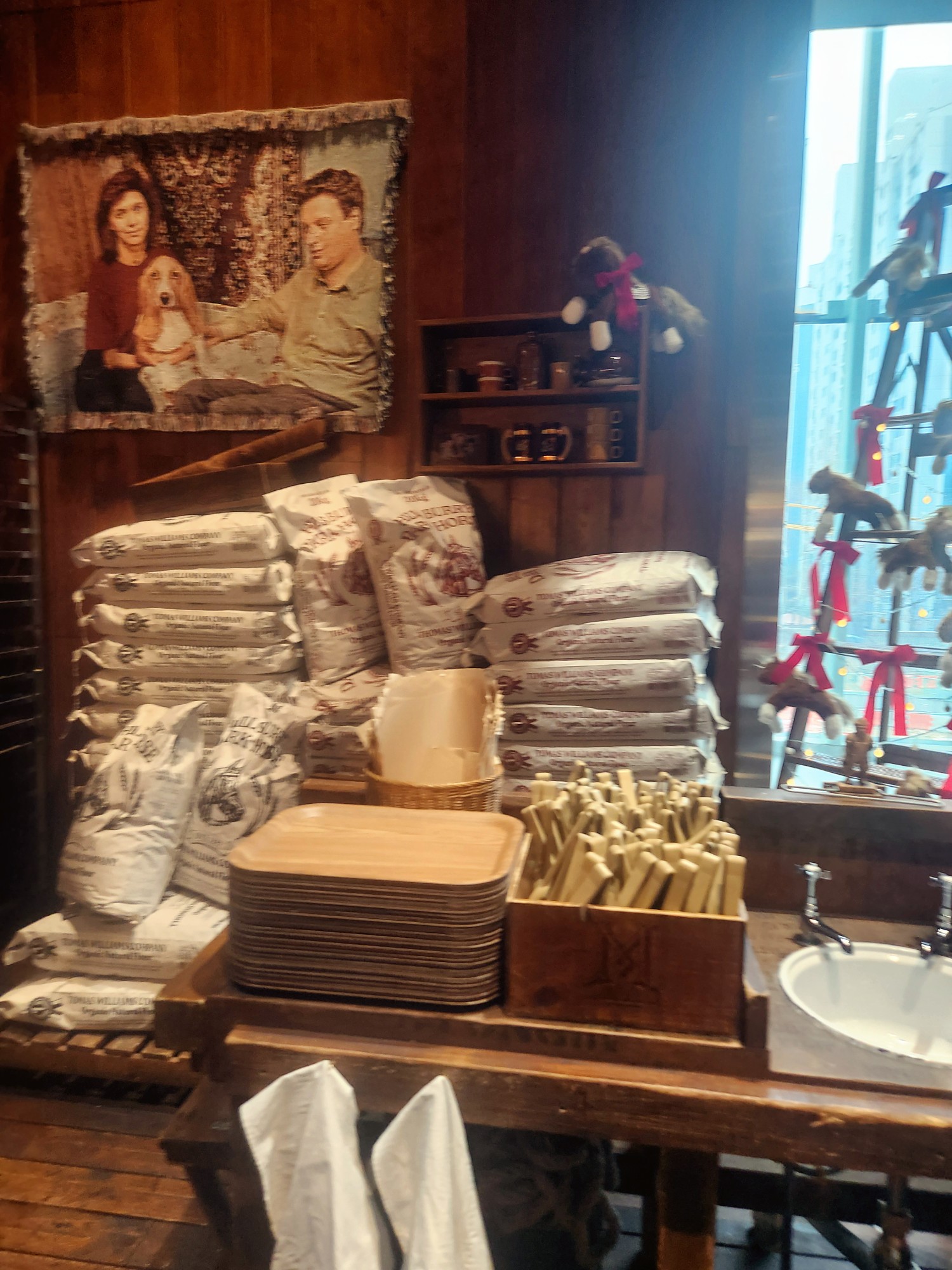 붉은 벽돌과 우드 톤의 가구들이 어우러져 마치 영국 런던의 오래된 베이커리에 온 듯한 착각을 불러일으킵니다.