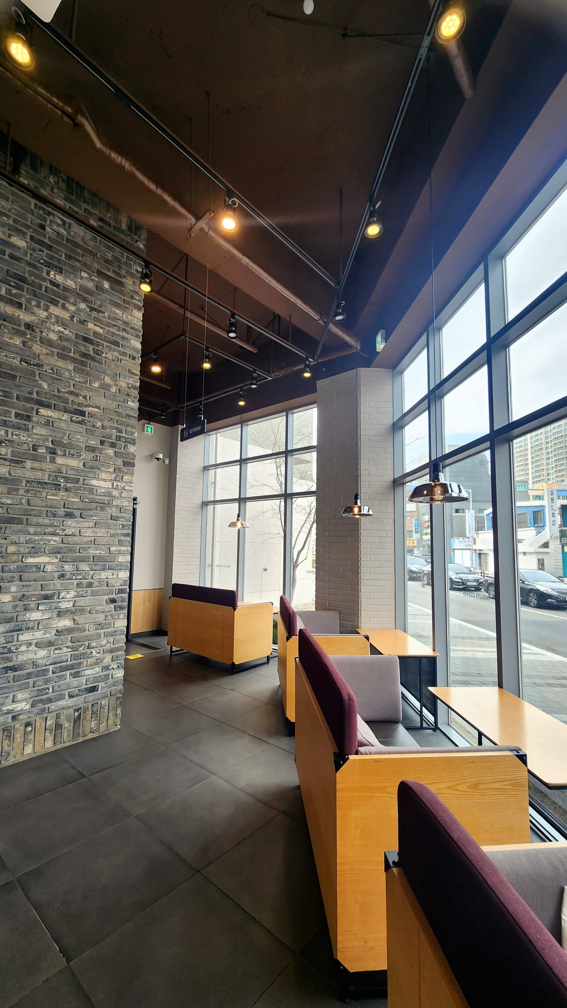 인테리어는 따뜻한 우드 톤과 세련된 벽돌 마감이 조화를 이룹니다.