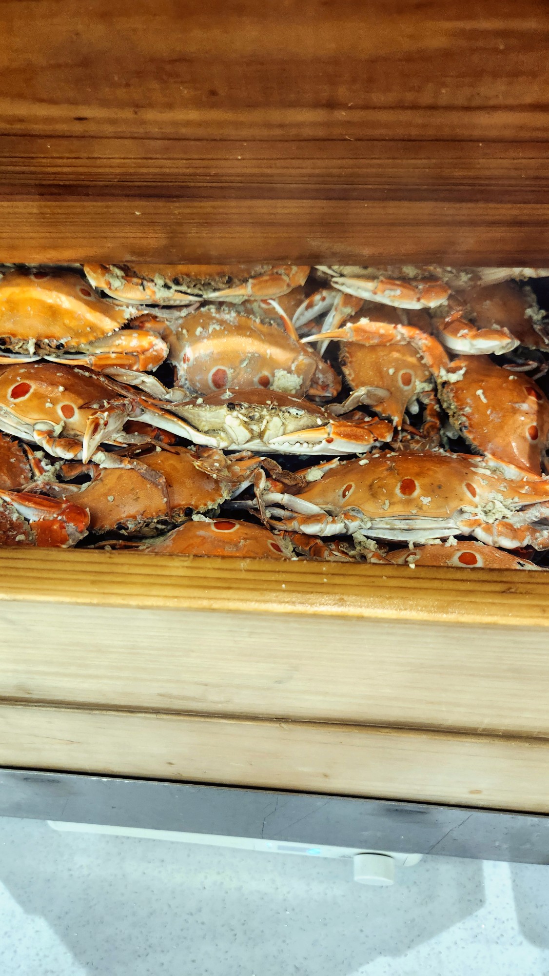 편백나무 찜기 같은 곳에 가득 쌓인 꽃게들을 보셨나요~