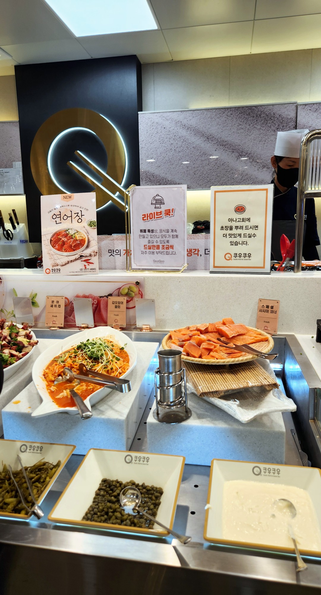 사시미 코너에는 신선한 생연어와 자숙 문어 갑오징어 물회까지 준비되어 있어 해산물 킬러들에게는 천국입니다.