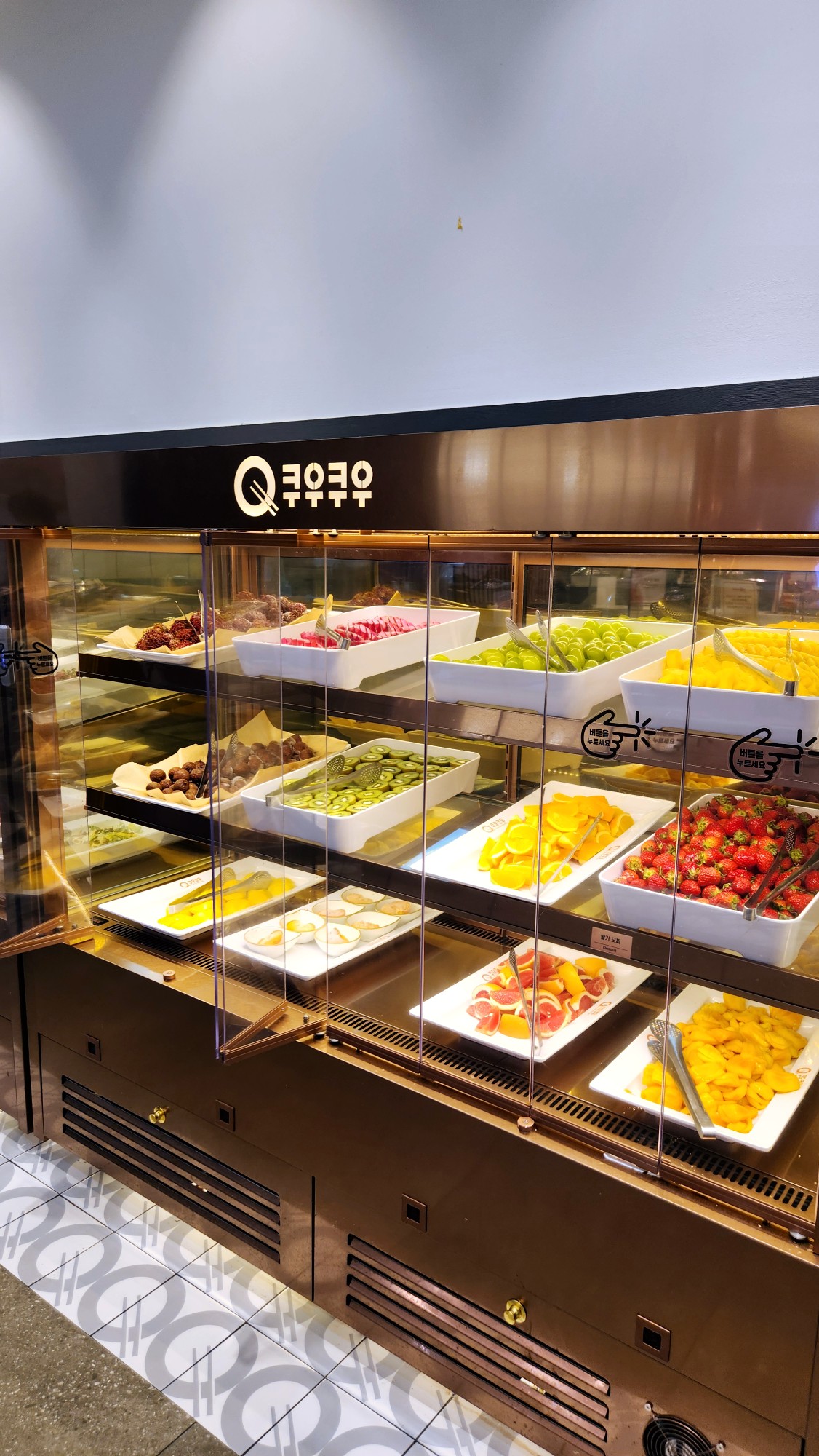 * 과일 쇼케이스 딸기 포도 망고 키위 등 신선한 과일들이 차갑게 유지되고 있습니다.