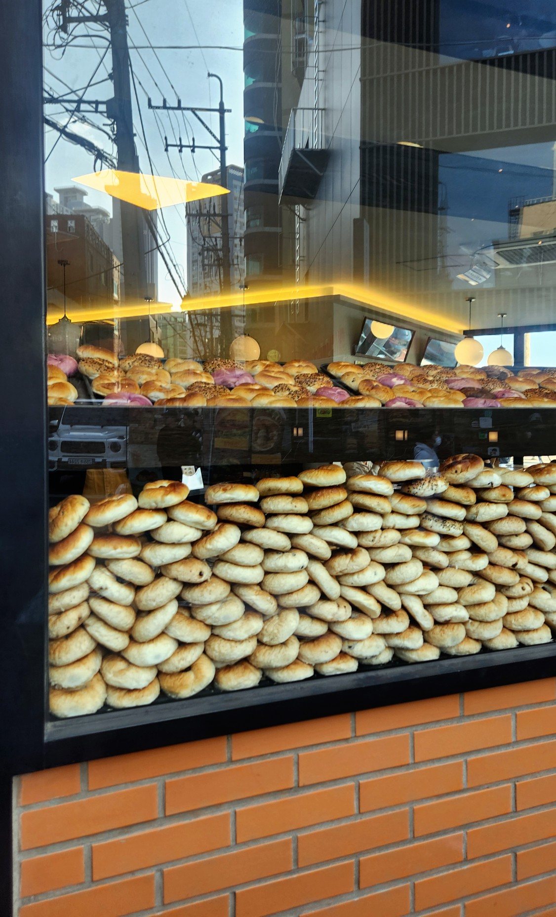 매장에 들어서면 가장 먼저 눈에 띄는 것은 산더미처럼 쌓인 베이글 모형입니다.