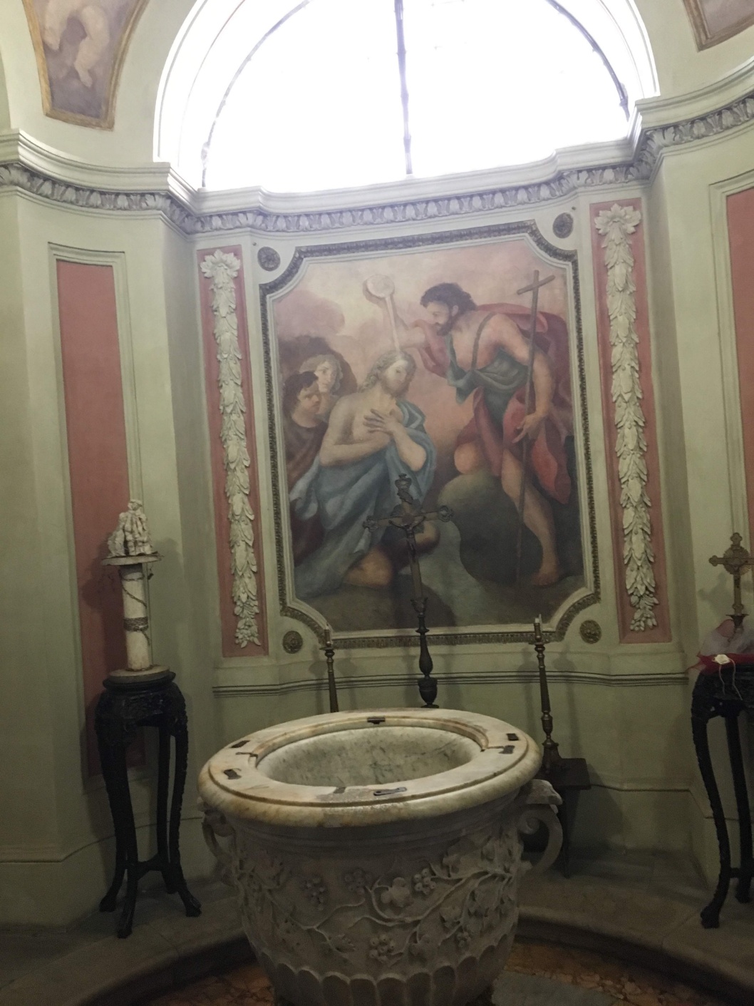 정문 상부의 십자가에 못 박힌 예수 목상 양옆에 코린트 양식기둥은 고대로마 시대에 지어진 건물에서 옮겨왔다고 한다.