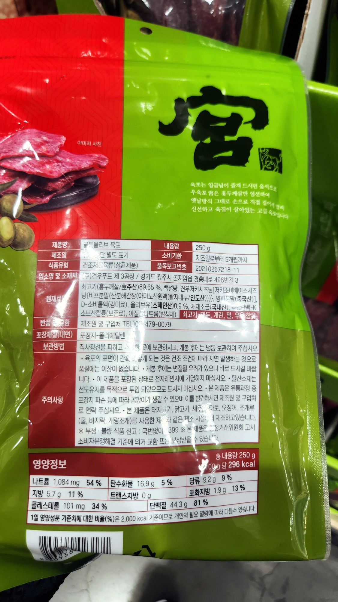 초록색 패키지의 골든 올리브 육포는 건강과 맛을 동시에 잡으려는 노력이 엿보이는 제품입니다.