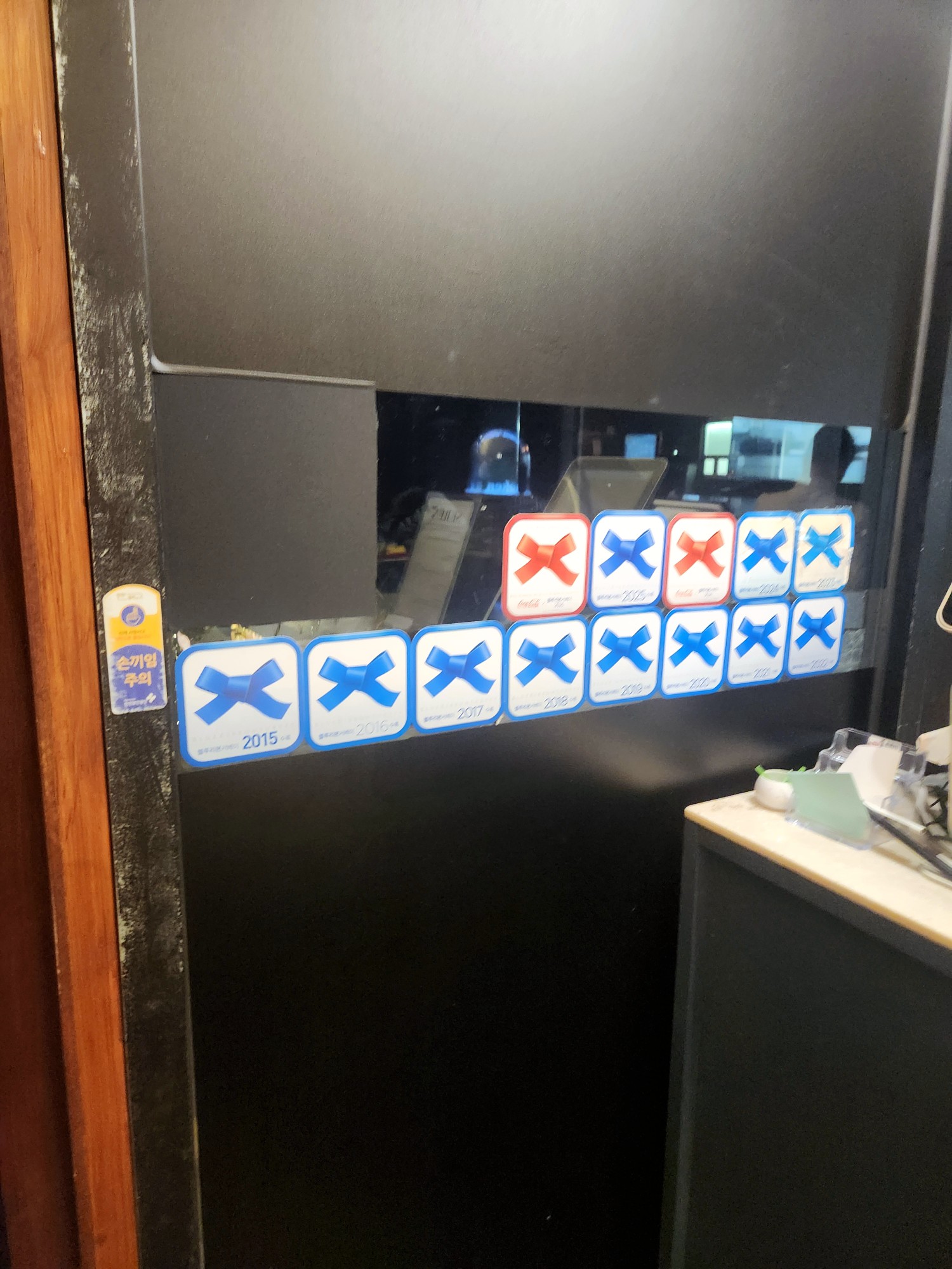 문을 열기도 전에 눈에 띄는 것은 바로 유리창 가득 붙어 있는 블루리본 서베이 스티커예요.