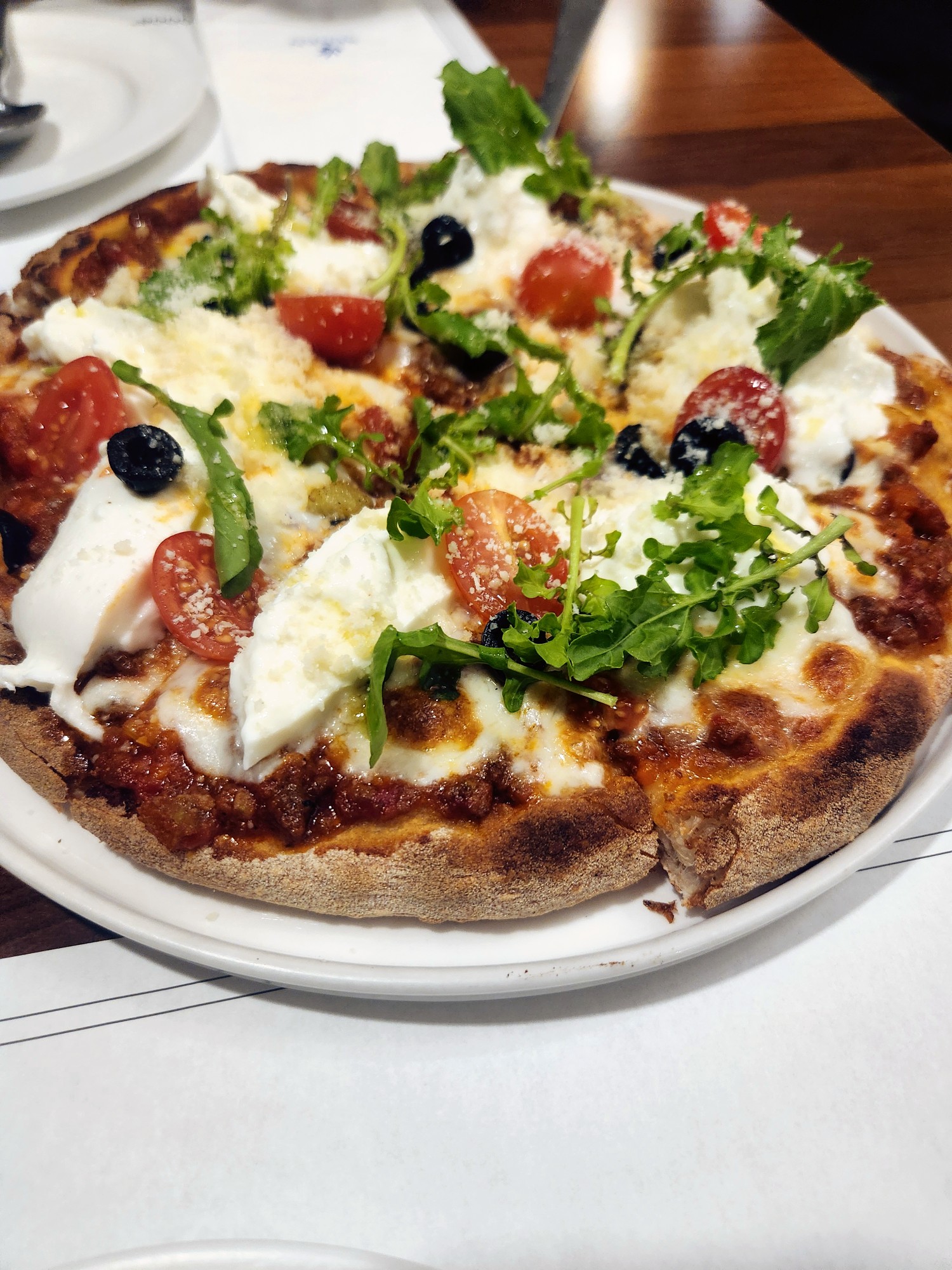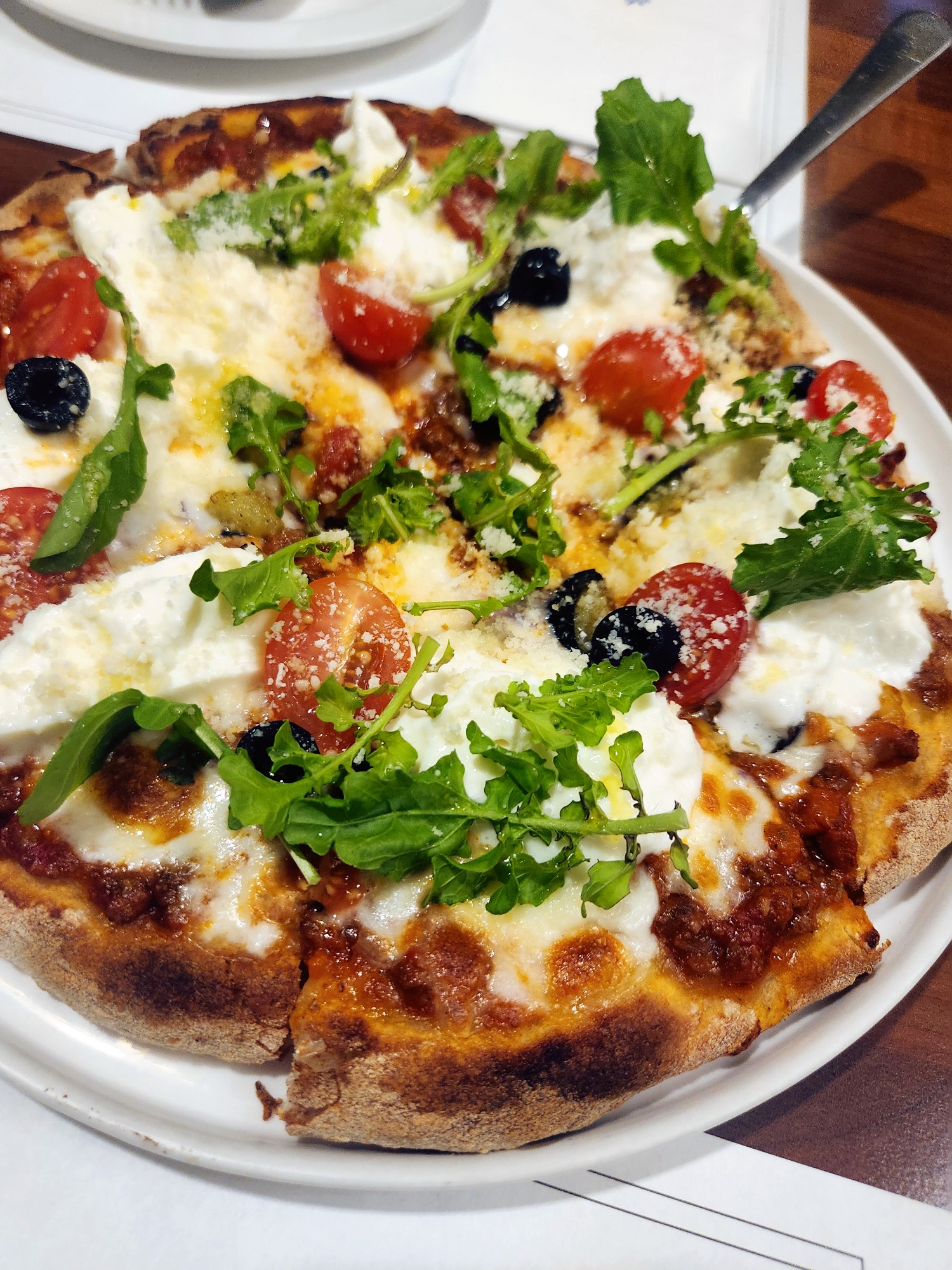 화덕에서 구워낸 듯 담백하고 쫄깃한 도우 위에 신선한 루꼴라와 상큼한 토마토 그리고 크리미 한 부라타 치즈가 통째로 올라가 있습니다.