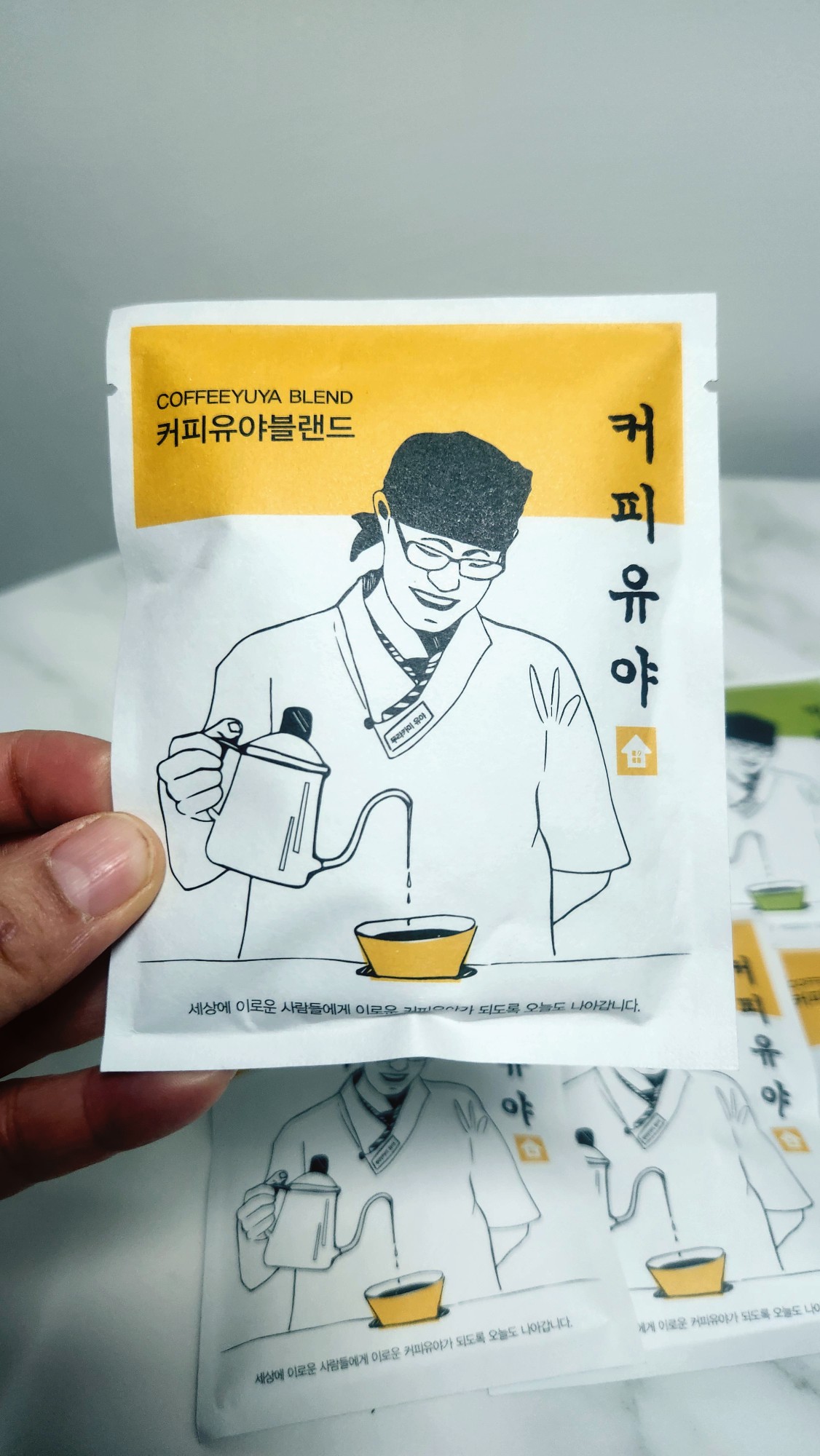 특히 저 노란색과 연두색의 드립백 봉투! 색감이 너무 예뻐서 홈카페 선반에 올려두기만 해도 인테리어 소품 역할을 톡톡히 해요.