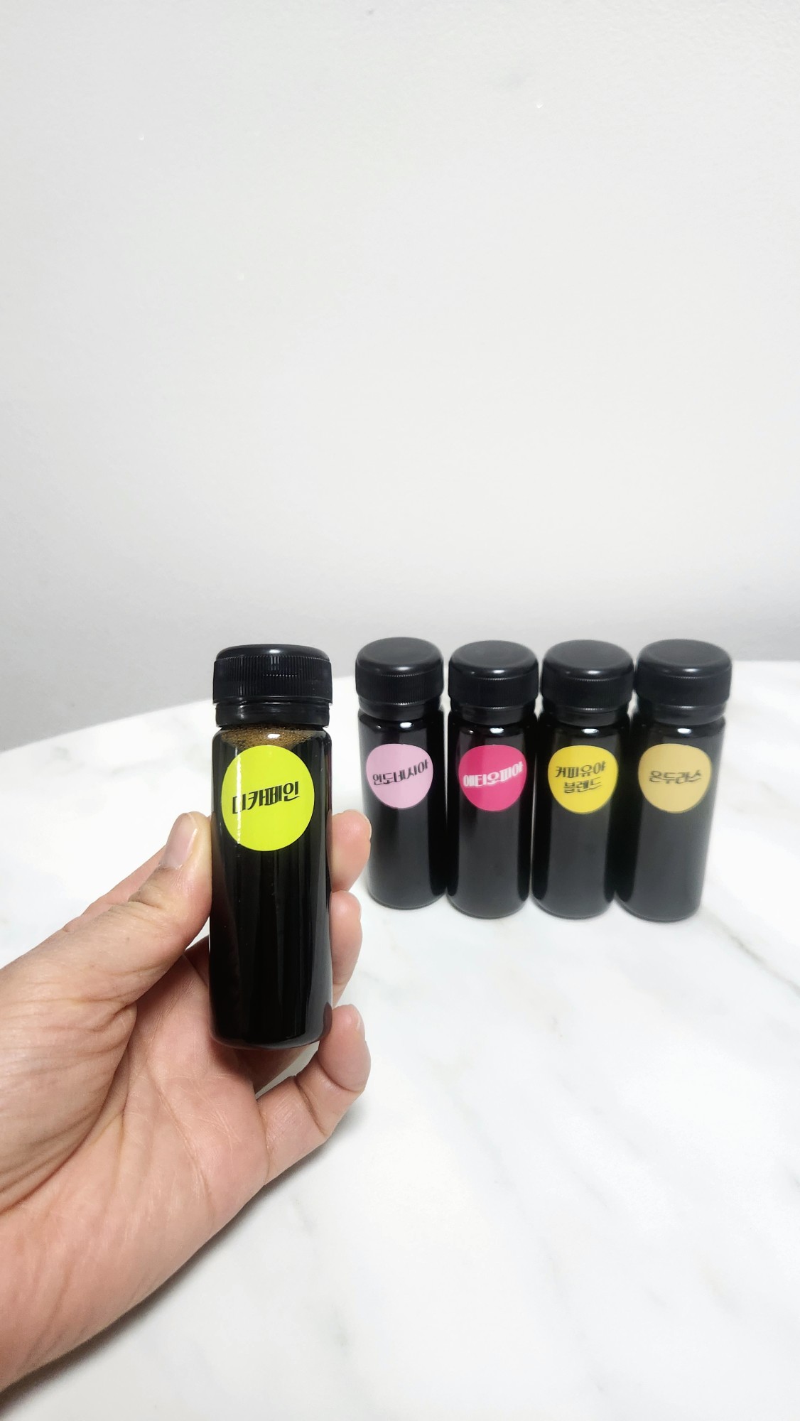 이번 선물 세트의 하이라이트는 바로 이 작고 소중한 더치커피 콜드브루 원액들이에요.