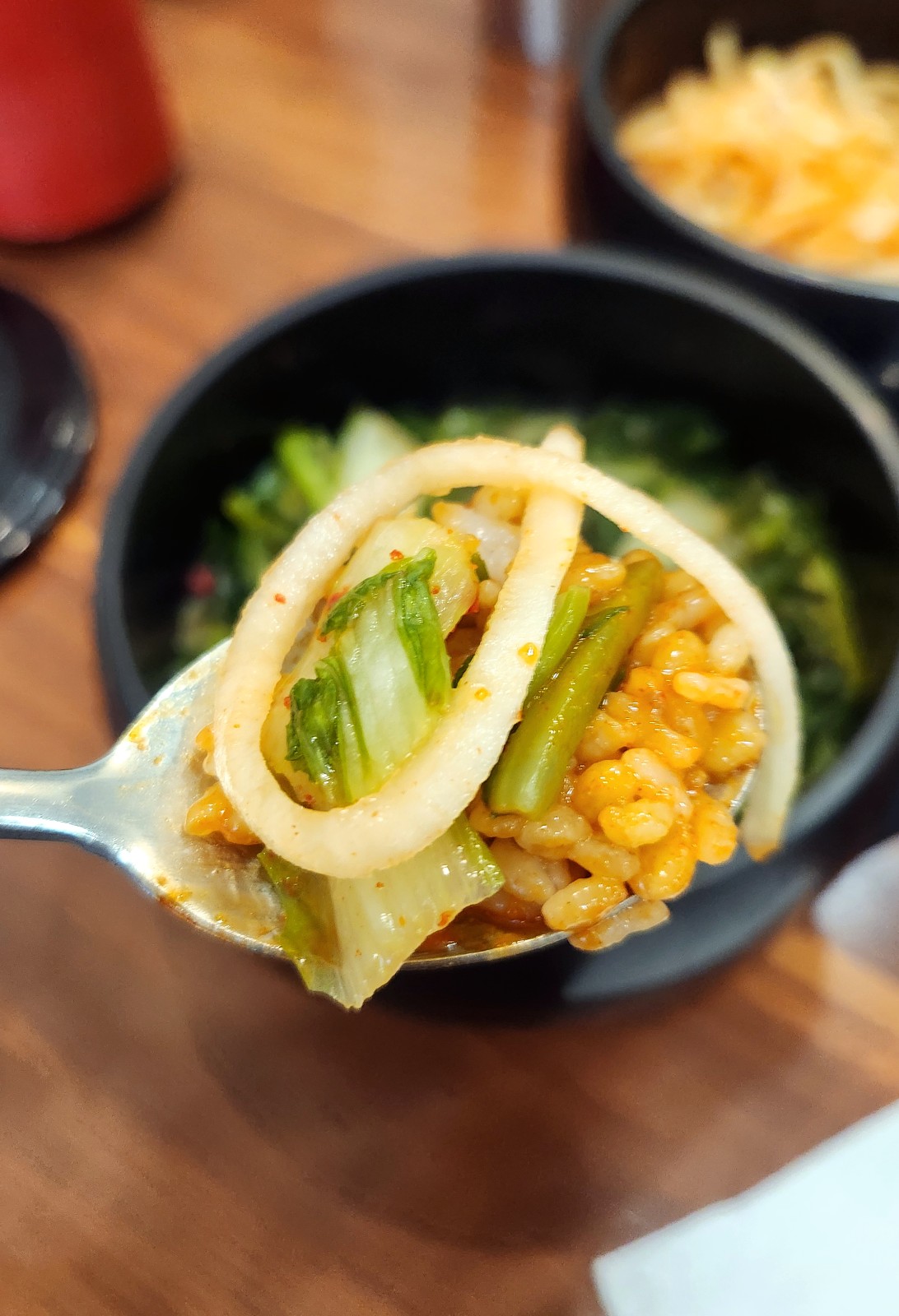 자리에 앉으면 항아리에 담긴 시원한 열무김치와 무생채가 나오는데 테이블에 비치된 고추장을 보리밥에 넣고 슥슥 비벼 먹으면 입맛이 확 살아납니다.